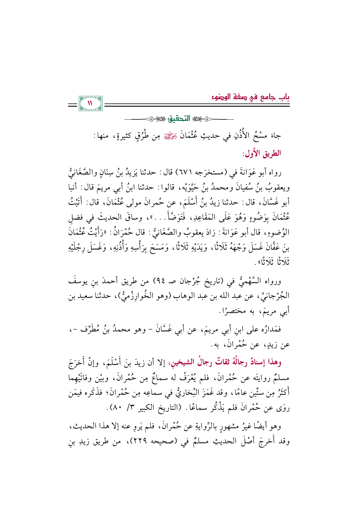 رواه أبو عَوَانةَ في (مستخرَجه ٦٧١) قال: حدثنا يَزيدُ بنُ سِنَانٍ والصَّغَانيُّ ويعقوبُ بنُ سُفيانَ ومحمدُ بنُ حَيَّوَيْه، قالوا: حدثنا ابنُ أبي مريمَ قال: أنبا أبو غَسَّانَ، قال: حدثنا زيدُ بنُ أَسْلَمَ، عن حُمرانَ مولى عُثْمَانَ، قال: أَتَيْتُ عُثْمَانَ بِوَضُوءٍ وَهُوَ عَلَى المَقَاعِدِ، فَتَوَضَّأَ ... "، وساقَ الحديثَ في فضلِ الوُضوءِ، قال أبو عَوَانةَ: زادَ يعقوبُ والصَّغَانيُّ: قال حُمْرَانُ: ((رَأَيْتُ عُثْمَانَ بنَ عَفَّانَ غَسَلَ وَجْهَهُ ثَلَاثًا، وَيَدَيْهِ ثَلَاثًا، وَمَسَحَ بِرَأْسِهِ وَأُذُنِهِ، وَغَسَلَ رِجْلَيْهِ ثَلَاثًا ثَلَاثًا)).
