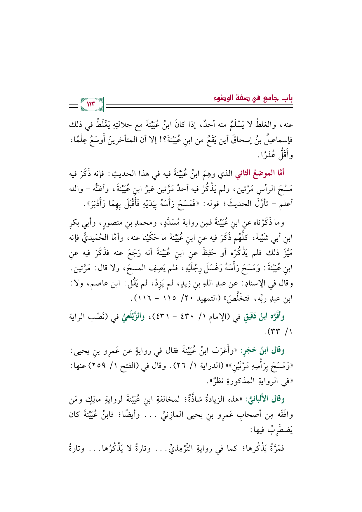 وقال ابنُ حَجَرٍ: "وأَغرَبَ ابنُ عُيَيْنةَ فقال في روايةٍ عن عَمرِو بنِ يحيى: ((وَمَسَحَ بِرَأْسِهِ مَرَّتَيْنِ)) " (الدراية ١/ ٢٦). وقال في (الفتح ١/ ٢٥٩) عنها: "في الروايةِ المذكورةِ نظرٌ".