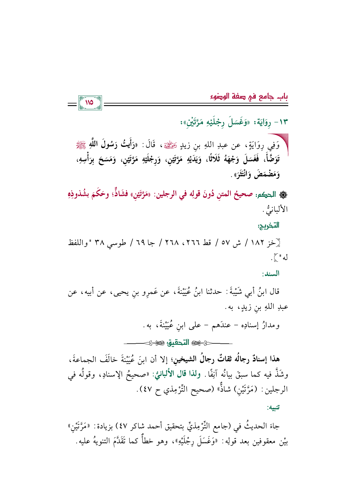 ولذا قال الألبانيُّ: ((صحيحُ الإسنادِ، وقولُه في الرجلين: (مَرَّتَيْنِ) شاذٌّ)) (صحيح التِّرْمِذي ح ٤٧).