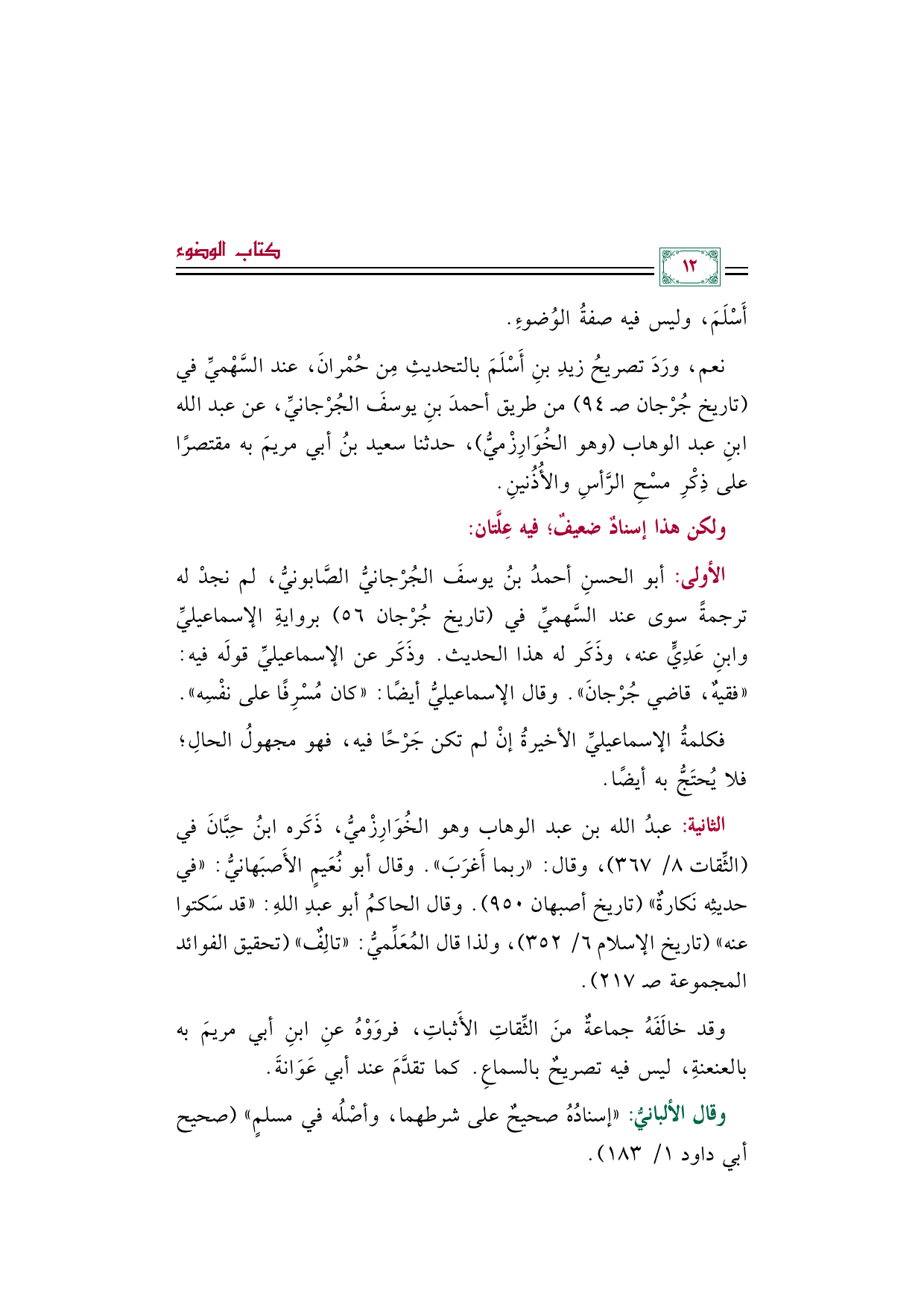 نعم، ورَدَ تصريحُ زيدِ بنِ أَسْلَمَ بالتحديثِ مِن حُمْرانَ، عند السَّهْميِّ في (تاريخ جُرْجان صـ ٩٤) من طريق أحمدَ بنِ يوسفَ الجُرْجانيِّ، عن عبد الله بنِ عبد الوهاب (وهو الخُوَارِزْميُّ)، حدثنا سعيد بنُ أبي مريمَ به مقتصرًا على ذِكْرِ مسْحِ الرَّأسِ والأُذُنينِ.