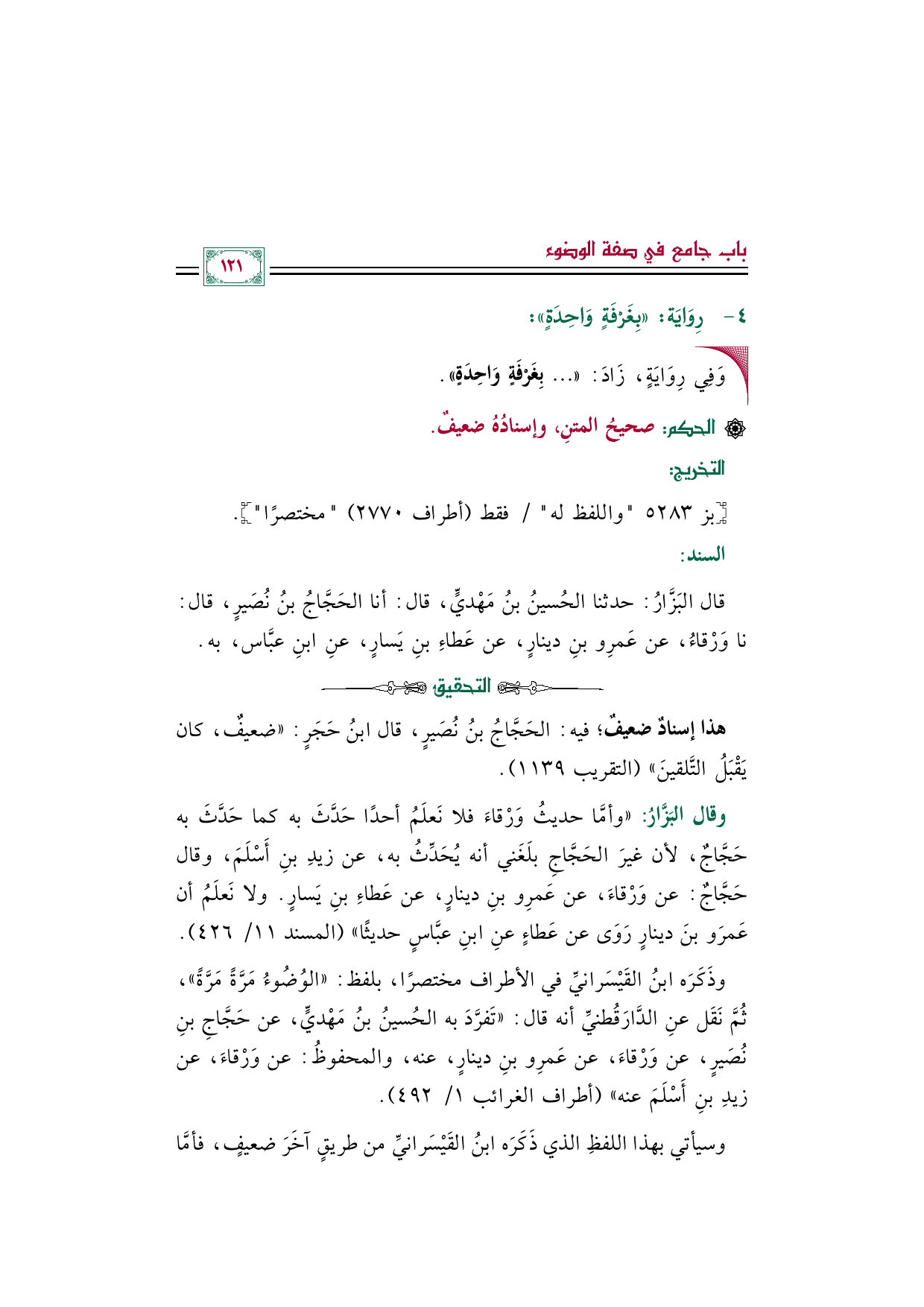 وذَكَرَه ابنُ القَيْسَرانيِّ في الأطراف مختصرًا، بلفظ: "الوُضُوءُ مَرَّةً مَرَّةً"، ثُمَّ نَقَل عنِ الدَّارَقُطنيِّ أنه قال: "تَفرَّدَ به الحُسينُ بنُ مَهْديٍّ، عن حَجَّاجِ بنِ نُصَيرٍ، عن وَرْقاءَ، عن عَمرِو بنِ دينارٍ، عنه، والمحفوظُ: عن وَرْقاءَ، عن زيدِ بنِ أَسْلَمَ عنه" (أطراف الغرائب ١/ ٤٩٢).