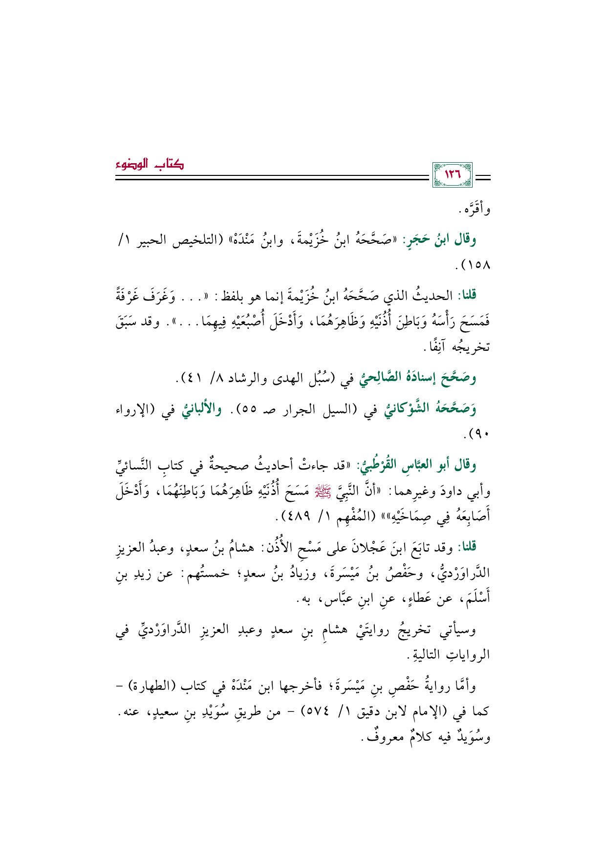 قلنا: وقد تابَعَ ابنَ عَجْلانَ على مَسْحِ الأُذُن: هشامُ بنُ سعدٍ، وعبدُ العزيزِ الدَّراوَرْديُّ، وحَفْصُ بنُ مَيْسَرةَ، وزيادُ بنُ سعدٍ؛ خمستُهم: عن زيدِ بنِ أَسْلَمَ، عن عَطاءٍ، عنِ ابنِ عبَّاس، به.