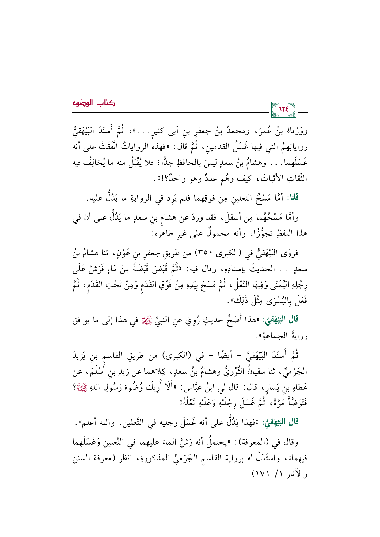 ووَرْقاءُ بنُ عُمرَ، ومحمدُ بنُ جعفرِ بنِ أبي كثيرٍ ... ))، ثُمَّ أَسنَدَ البَيْهَقيُّ رواياتِهمُ التي فيها غَسْلُ القدمينِ، ثُمَّ قال: ((فهذه الرواياتُ اتَّفَقَتْ على أنه غَسَلَهما ... وهشامُ بنُ سعدٍ ليسَ بالحافظِ جدًّا؛ فلا يُقْبَلُ منه ما يُخالِفُ فيه الثِّقاتِ الأثباتَ، كيف وهُم عددٌ وهو واحدٌ؟ ! )).