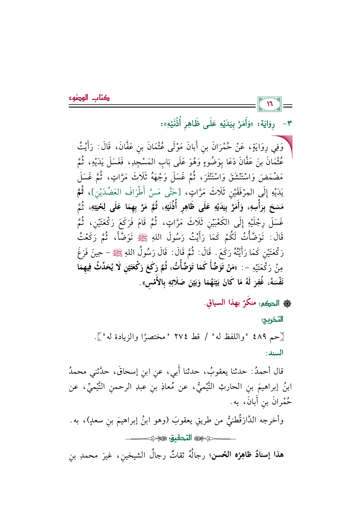 • وَفِي رِوَايَةٍ، عَنْ حُمْرَانَ بنِ أَبانَ مَوْلَى عُثْمَانَ بنِ عَفَّانَ، قَالَ: رَأَيْتُ عُثْمَانَ بنَ عَفَّانَ دَعَا بِوَضُوءٍ وَهُوَ عَلَى بَابِ المَسْجِدِ، فَغَسَلَ يَدَيْهِ، ثُمَّ مَضْمَضَ وَاسْتَنْشَقَ وَاسْتَنْثَرَ، ثُمَّ غَسَلَ وَجْهَهُ ثَلَاثَ مَرَّاتٍ، ثُمَّ غَسَلَ يَدَيْهِ إِلَى المِرْفَقَيْنِ ثَلَاثَ مَرَّاتٍ، [حَتَّى مَسَّ أَطْرَافَ العَضُدَيْنِ]، ثُمَّ مَسَحَ بِرَأْسِهِ، وَأَمَرَّ بِيَدَيْهِ عَلَى ظَاهِرِ أُذُنَيْهِ، ثُمَّ مَرَّ بِهِمَا عَلَى لِحْيَتِهِ، ثُمَّ غَسَلَ رِجْلَيْهِ إِلَى الكَعْبَيْنِ ثَلَاثَ مَرَّاتٍ، ثُمَّ قَامَ فَرَكَعَ رَكْعَتَيْنِ، ثُمَّ قَالَ: تَوَضَّأْتُ لَكُمْ كَمَا رَأَيْتُ رَسُولَ اللهِ صلى الله عليه وسلم تَوَضَّأَ، ثُمَّ رَكَعْتُ رَكْعَتَيْنِ كَمَا رَأَيْتُهُ رَكَعَ. قَالَ: ثُمَّ قَالَ: قَالَ رَسُولُ اللهِ صلى الله عليه وسلم -حِينَ فَرَغَ مِنْ رَكْعَتَيْهِ-: ((مَنْ تَوَضَّأَ كَمَا تَوَضَّأْتُ، ثُمَّ رَكَعَ رَكْعَتَيْنِ لَا يُحَدِّثُ فِيهِمَا نَفْسَهُ، غُفِرَ لَهُ مَا كَانَ بَيْنَهُمَا وَبَيْنَ صَلَاتِهِ بِالأَمْسِ)).