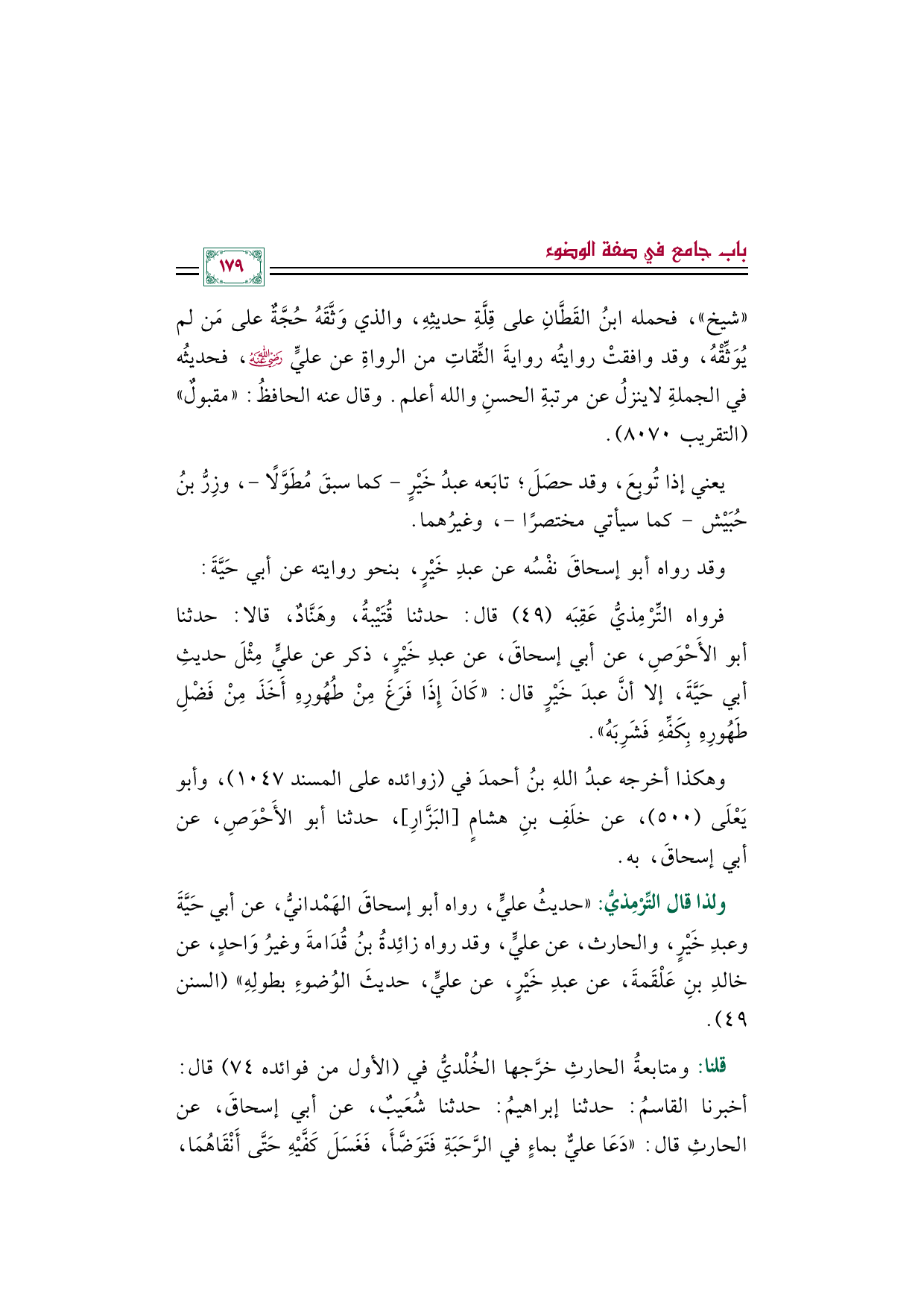 ولذا قال التِّرْمِذيُّ: "حديثُ عليٍّ، رواه أبو إسحاقَ الهَمْدانيُّ، عن أبي حَيَّةَ وعبدِ خَيْرٍ، والحارث، عن عليٍّ، وقد رواه زائِدةُ بنُ قُدَامةَ وغيرُ وَاحدٍ، عن خالدِ بنِ عَلْقَمةَ، عن عبدِ خَيْرٍ، عن عليٍّ، حديثَ الوُضوءِ بطولِهِ" (السنن ٤٩).