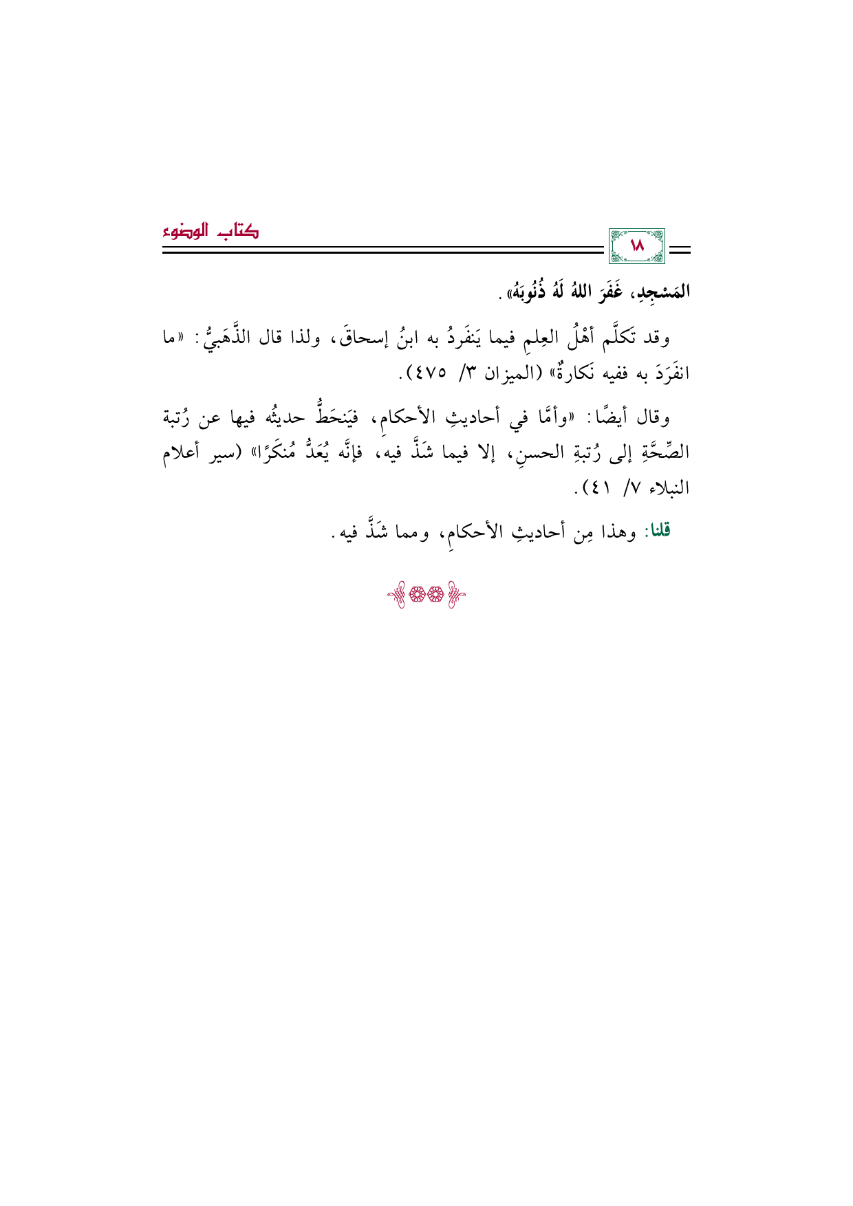وقد تَكلَّم أهْلُ العِلمِ فيما يَنفَردُ به ابنُ إسحاقَ، ولذا قال الذَّهَبيُّ: "ما انفَرَدَ به ففيه نَكارةٌ" (الميزان ٣/ ٤٧٥).