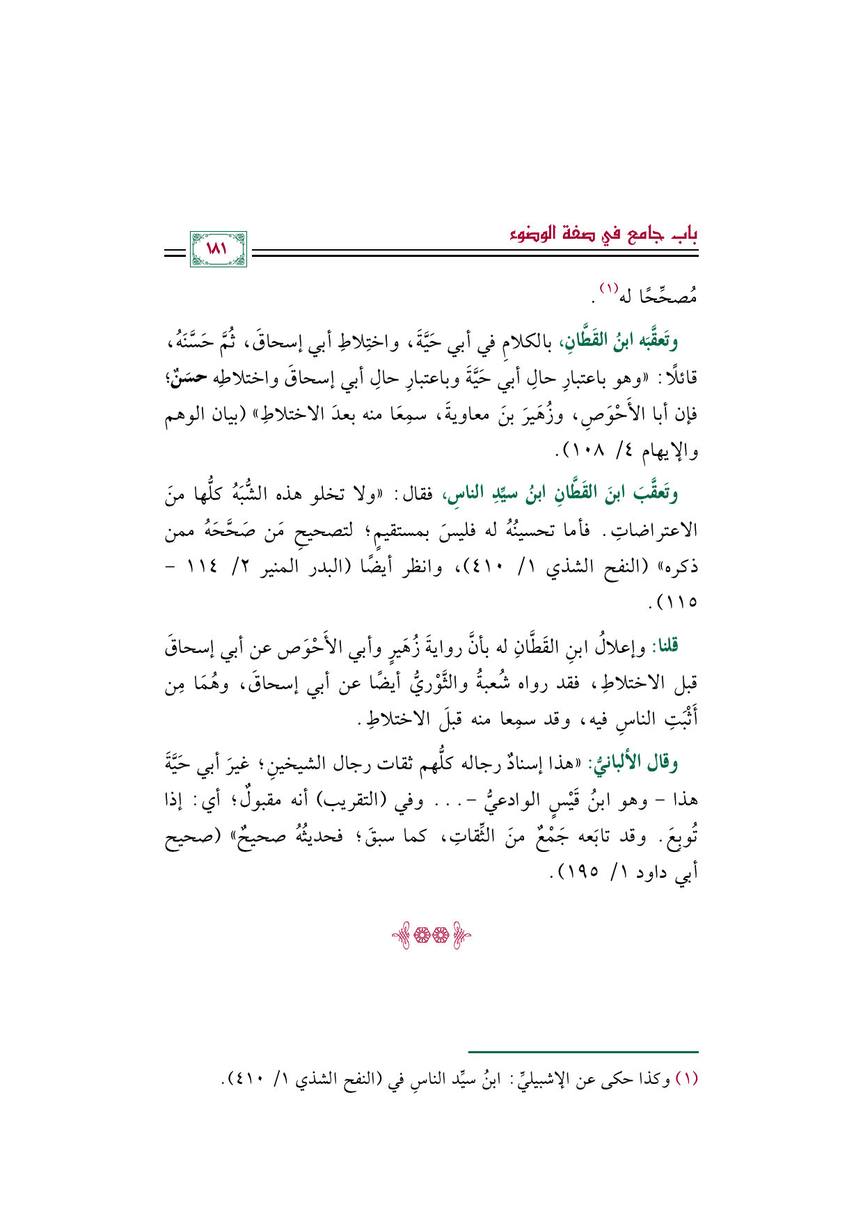 قلنا: وإعلالُ ابنِ القَطَّانِ له بأنَّ روايةَ زُهَيرٍ وأبي الأَحْوَص عن أبي إسحاقَ قبل الاختلاطِ، فقد رواه شُعبةُ والثَّوْريُّ أيضًا عن أبي إسحاقَ، وهُمَا مِن أَثْبَتِ الناسِ فيه، وقد سمِعا منه قبلَ الاختلاطِ.