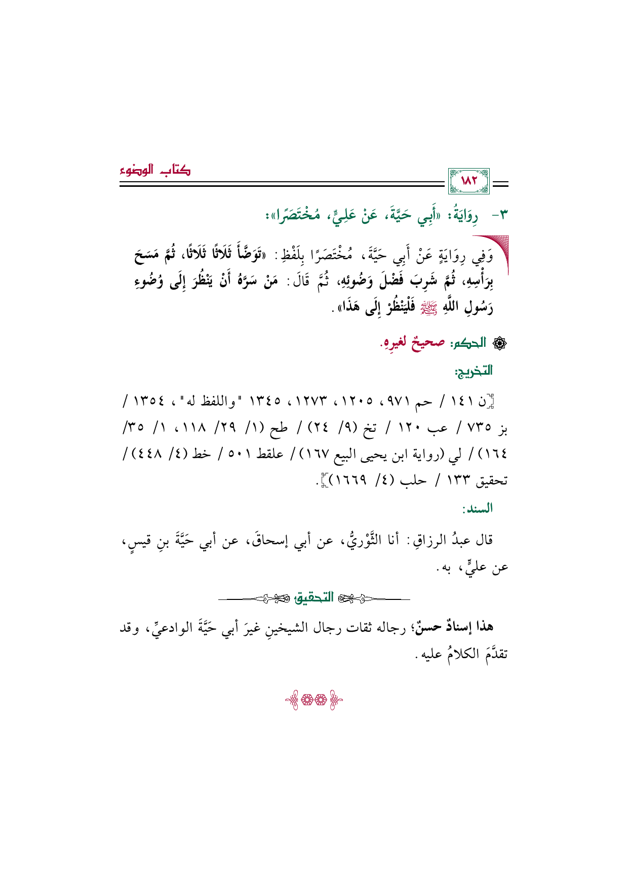 • وَفِي رِوَايَةٍ عَنْ أَبِي حَيَّةَ، مُخْتَصَرًا بِلَفْظِ: ((تَوَضَّأَ ثَلَاثًا ثَلَاثًا، ثُمَّ مَسَحَ بِرَأْسِهِ، ثُمَّ شَرِبَ فَضْلَ وَضُوئِهِ، ثُمَّ قَالَ: مَنْ سَرَّهُ أَنْ يَنْظُرَ إِلَى وُضُوءِ رَسُولِ اللَّهِ صلى الله عليه وسلم فَلْيَنْظُرْ إِلَى هَذَا)).