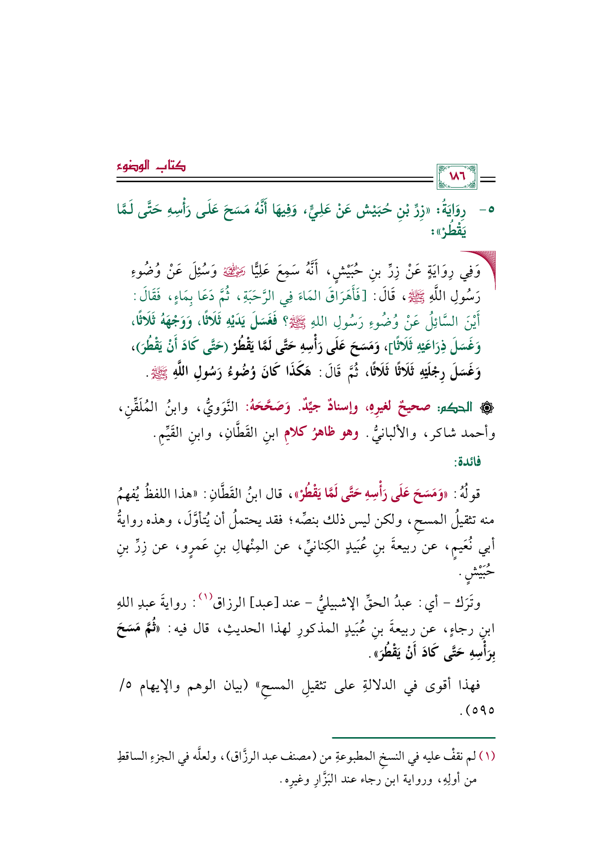 قولُهُ: ((وَمَسَحَ عَلَى رَأْسِهِ حَتَّى لَمَّا يَقْطُرْ))، قال ابنُ القَطَّانِ: ((هذا اللفظُ يُفهمُ منه تثقيلُ المسحِ، ولكن ليس ذلك بنصِّه؛ فقد يحتملُ أن يُتأوَّلَ، وهذه روايةُ أبي نُعَيمٍ، عن ربيعةَ بنِ عُبَيدٍ الكِنانيِّ، عن المِنْهالِ بنِ عَمرٍو، عن زِرِّ بنِ حُبَيْشٍ.