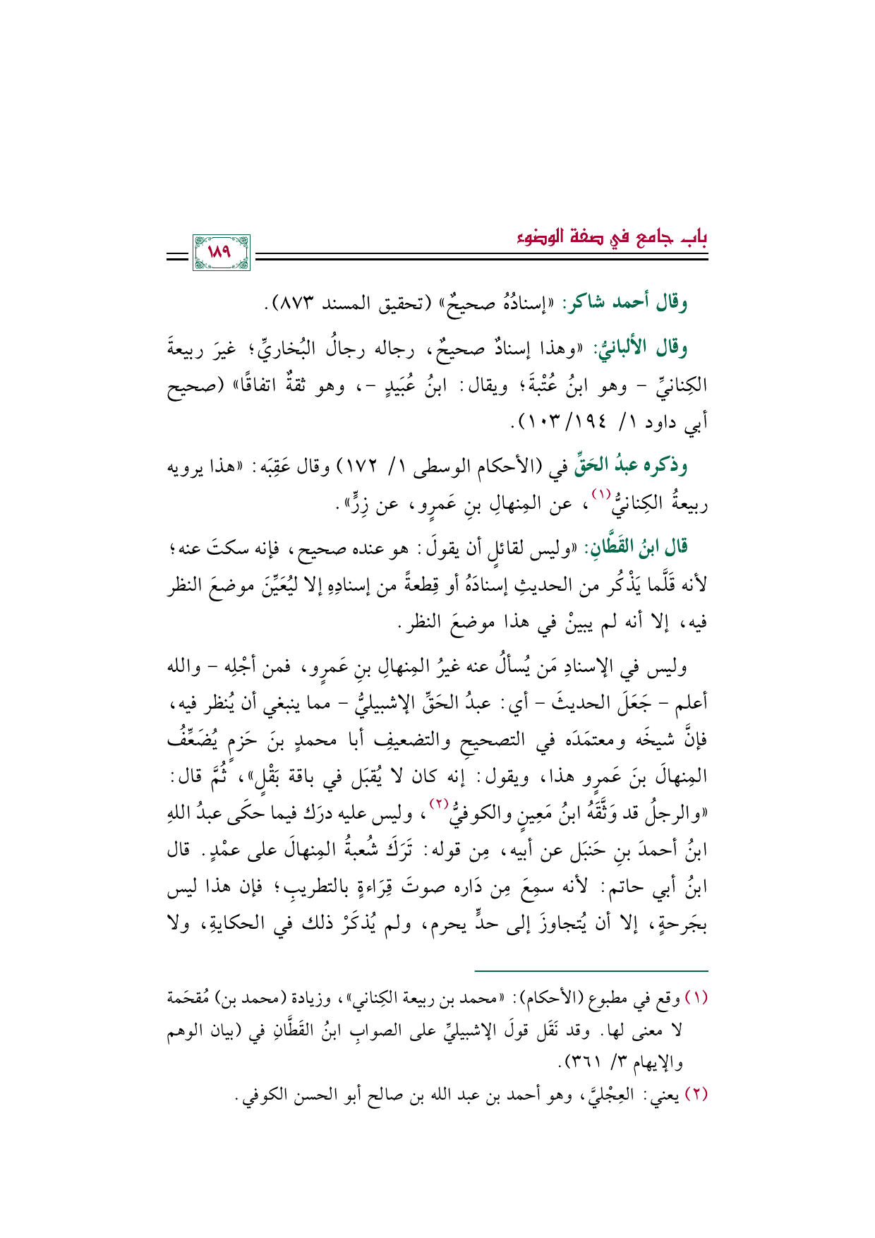 وذكره عبدُ الحَقِّ في (الأحكام الوسطى ١/ ١٧٢) وقال عَقِبَه: "هذا يرويه ربيعةُ الكِنانيُّ (¬١)، عن المِنهالِ بنِ عَمرٍو، عن زِرٍّ".