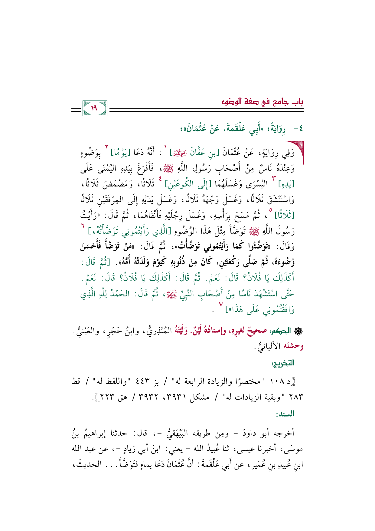 • وَفِي رِوَايَةٍ، عَنْ عُثْمَانَ [بنِ عَفَّانَ رضي الله عنه] ١: أَنَّهُ دَعَا [يَوْمًا] ٢ بِوَضُوءٍ وَعِنْدَهُ نَاسٌ مِنْ أَصْحَابِ رَسُولِ اللَّهِ صلى الله عليه وسلم، فَأَفْرَغَ بِيَدِهِ اليُمْنَى عَلَى [يَدِهِ] ٣ اليُسْرَى وَغَسَلَهُمَا [إِلَى الكُوعَيْنِ] ٤ ثَلَاثًا، وَمَضْمَضَ ثَلَاثًا، وَاسْتَنْشَقَ ثَلَاثًا، وَغَسَلَ وَجْهَهُ ثَلَاثًا، وَغَسَلَ يَدَيْهِ إِلَى المِرْفَقَيْنِ ثَلَاثًا [ثَلَاثًا] ٥، ثُمَّ مَسَحَ بِرَأْسِهِ، وَغَسَلَ رِجْلَيْهِ فَأَنْقَاهُمَا، ثُمَّ قَالَ: ((رَأَيْتُ رَسُولَ اللَّهِ صلى الله عليه وسلم تَوَضَّأَ مِثْلَ هَذَا الوُضُوءِ [الَّذِي رَأَيْتُمُونِي تَوَضَّأْتُهُ،] ٦ وَقَالَ: «تَوَضَّئُوا كَمَا رَأَيْتُمُونِي تَوَضَّأْتُ»، ثُمَّ قَالَ: «مَنْ تَوَضَّأَ فَأَحْسَنَ وُضُوءَهُ، ثُمَّ صَلَّى رَكْعَتَيْنِ، كَانَ مِنْ ذُنُوبِهِ كَيَوْمَ وَلَدَتْهُ أُمُّهُ». [ثُمَّ قَالَ: أَكَذَلِكَ يَا فُلَانُ؟ قَالَ: نَعَمْ. ثُمَّ قَالَ: أَكَذَلِكَ يَا فُلَانُ؟ قَالَ: نَعَمْ. حَتَّى اسْتَشْهَدَ نَاسًا مِنْ أَصْحَابِ النَّبِيِّ صلى الله عليه وسلم، ثُمَّ قَالَ: الحَمْدُ لِلَّهِ الَّذِي وَافَقْتُمُونِي عَلَى هَذَا))] ٧.