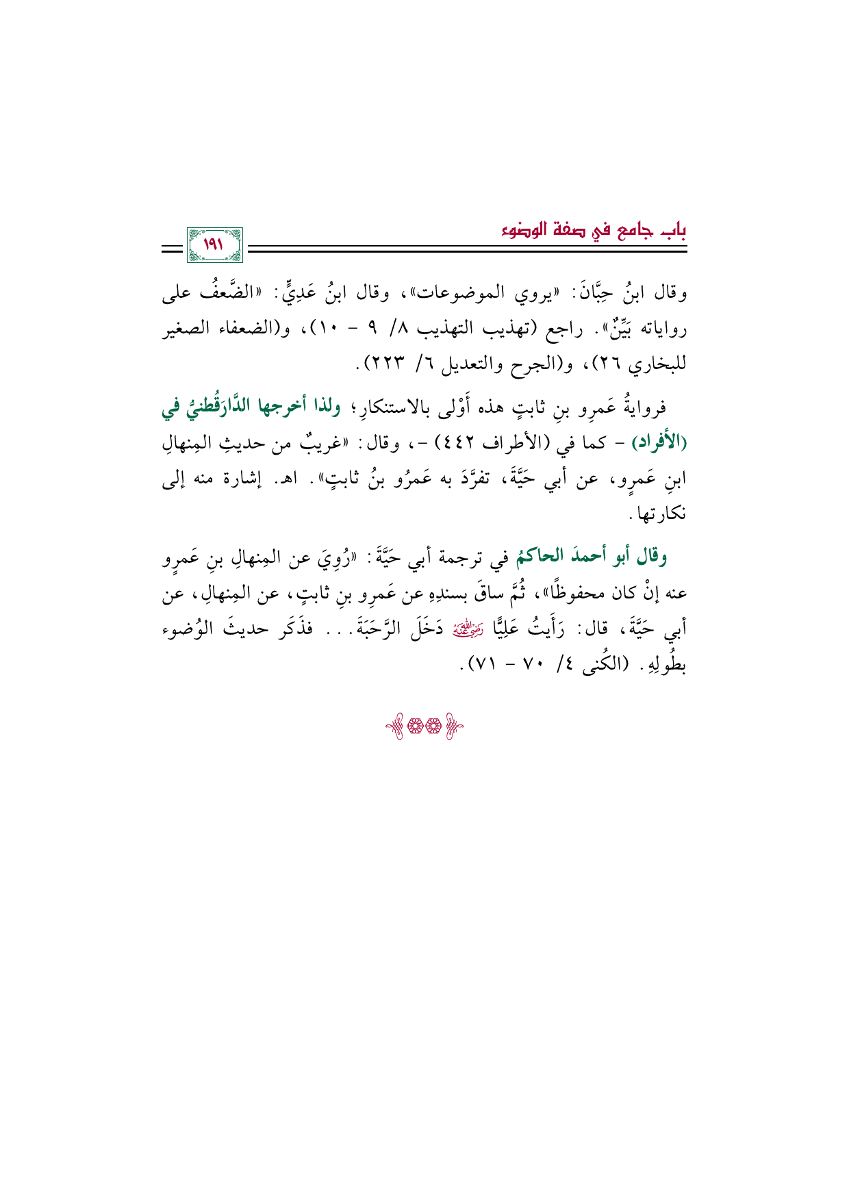 وقال أبو أحمدَ الحاكمُ في ترجمة أبي حَيَّةَ: "رُوِيَ عن المِنهالِ بنِ عَمرٍو عنه إنْ كان محفوظًا"، ثُمَّ ساقَ بسندِهِ عن عَمرِو بنِ ثابتٍ، عن المِنهالِ، عن أبي حَيَّةَ، قال: رَأَيتُ عَلِيًّا رضي الله عنه دَخَلَ الرَّحَبَةَ ... فذَكَر حديثَ الوُضوء بطُولِهِ. (الكُنى ٤/ ٧٠ - ٧١).
