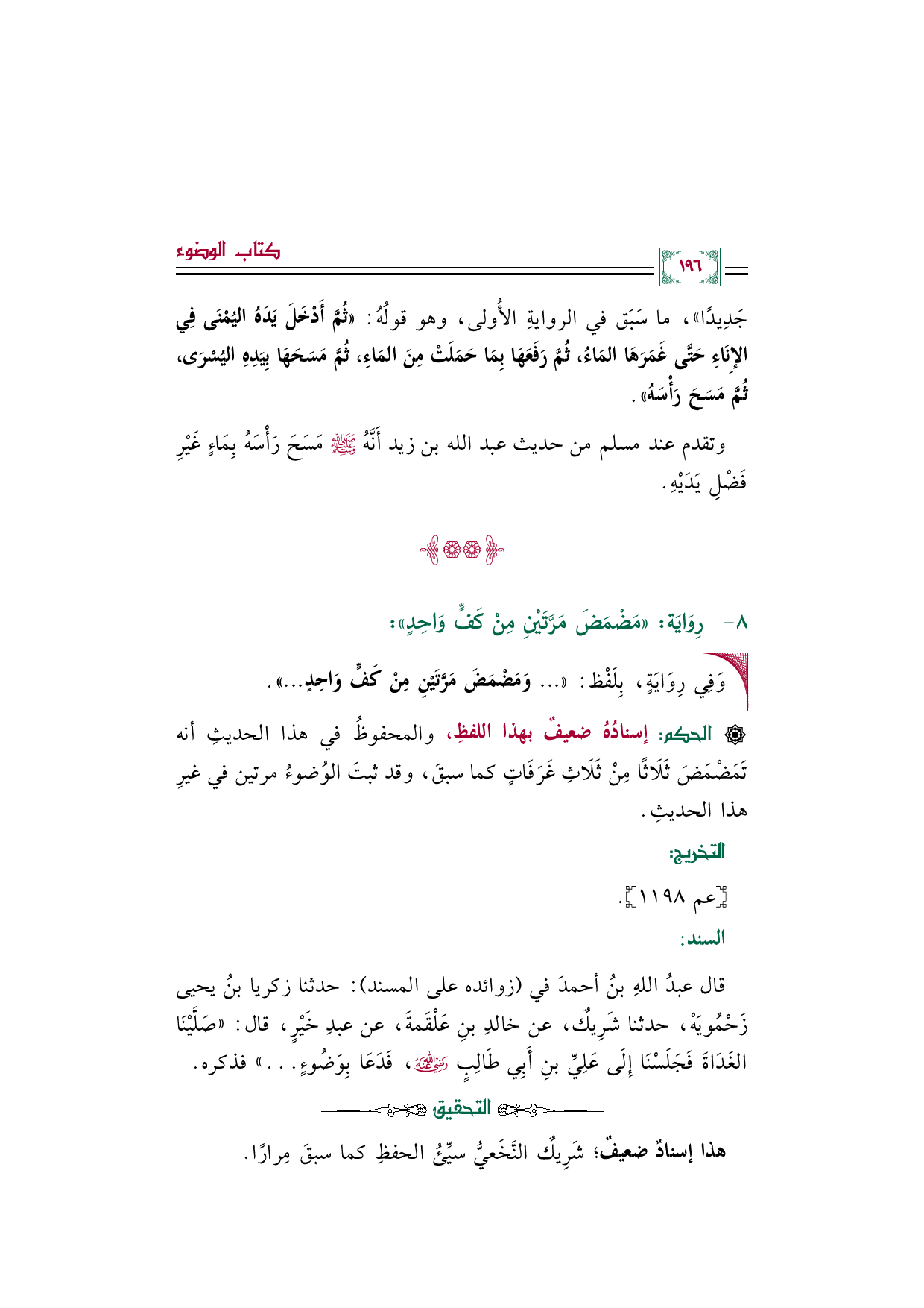 قال عبدُ اللهِ بنُ أحمدَ في (زوائده على المسند): حدثنا زكريا بنُ يحيى زَحْمُويَهْ، حدثنا شَرِيكٌ، عن خالدِ بنِ عَلْقَمةَ، عن عبدِ خَيْرٍ، قال: ((صَلَّيْنَا الغَدَاةَ فَجَلَسْنَا إِلَى عَلِيِّ بنِ أَبِي طَالِبٍ رضي الله عنه، فَدَعَا بِوَضُوءٍ ... )) فذكره.