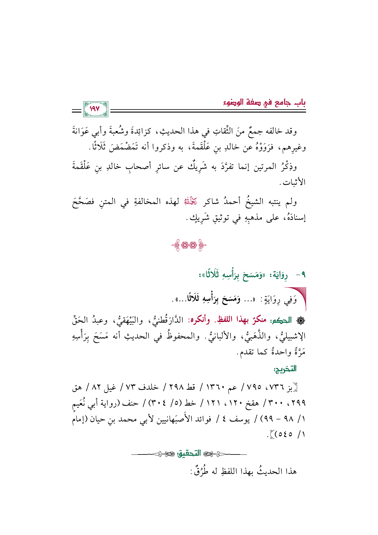 وقد خالفه جمعٌ منَ الثِّقاتِ في هذا الحديثِ، كزائِدةَ وشُعبةَ وأبي عَوَانةَ وغيرِهم، فرَوَوْهُ عن خالدِ بنِ عَلْقَمةَ، به وذكروا أنه تَمَضْمَضَ ثَلَاثًا.