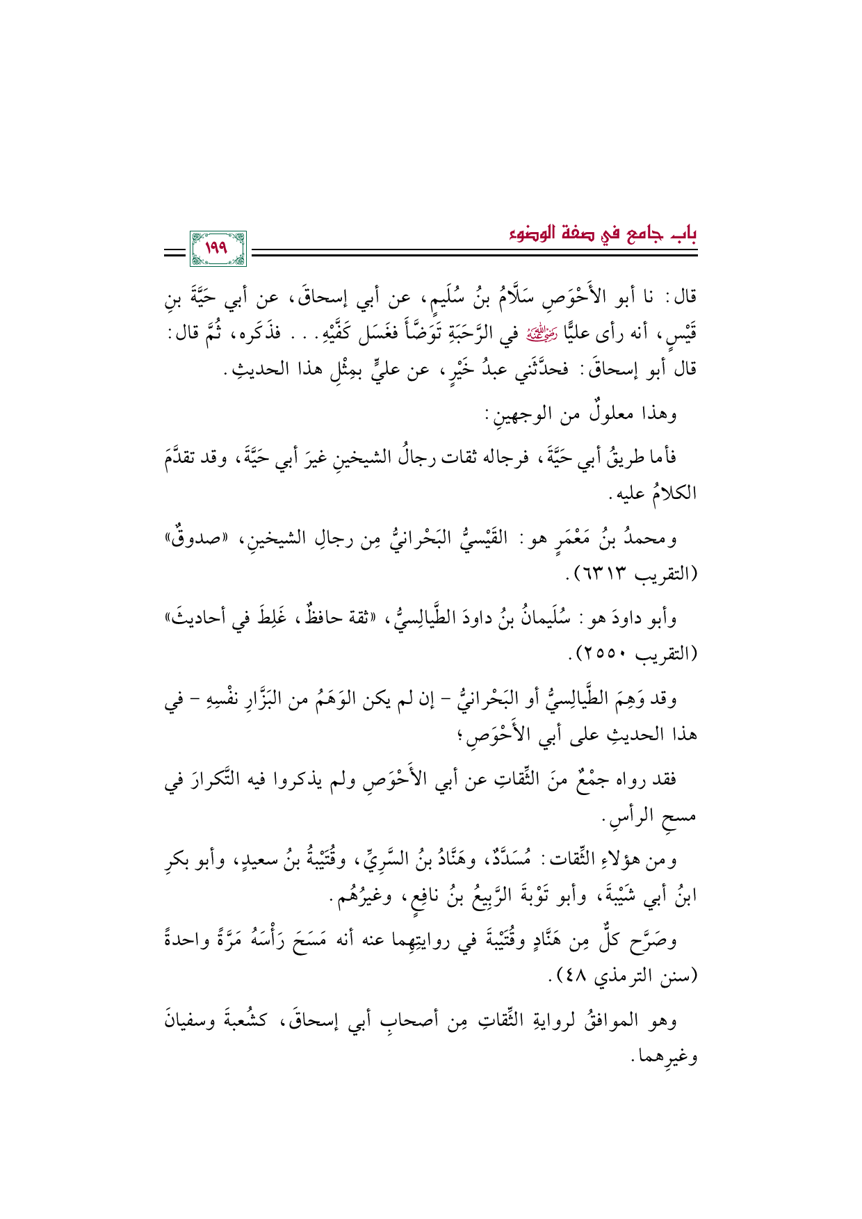 قال: نا أبو الأَحْوَصِ سَلَّامُ بنُ سُلَيمٍ، عن أبي إسحاقَ، عن أبي حَيَّةَ بنِ قَيْسٍ، أنه رأى عليًّا رضي الله عنه في الرَّحَبَةِ تَوَضَّأَ فغَسَل كَفَّيْهِ ... فذَكَره، ثُمَّ قال: قال أبو إسحاقَ: فحدَّثَني عبدُ خَيْرٍ، عن عليٍّ بمِثْلِ هذا الحديثِ.