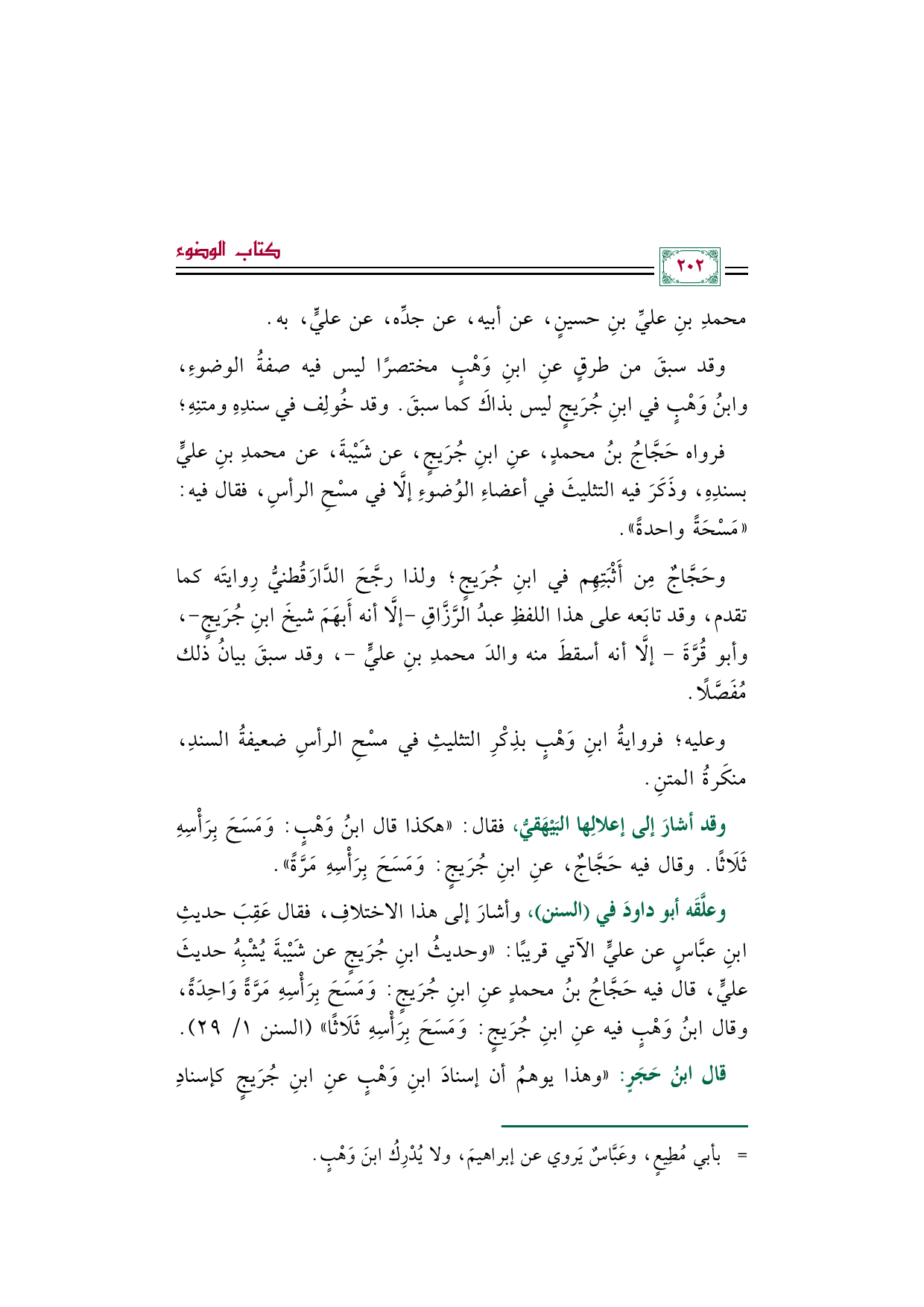 وقد أشارَ إلى إعلالِها البَيْهَقيُّ، فقال: "هكذا قال ابنُ وَهْبٍ: وَمَسَحَ بِرَأْسِهِ ثَلَاثًا. وقال فيه حَجَّاجٌ، عنِ ابنِ جُرَيجٍ: وَمَسَحَ بِرَأْسِهِ مَرَّةً".