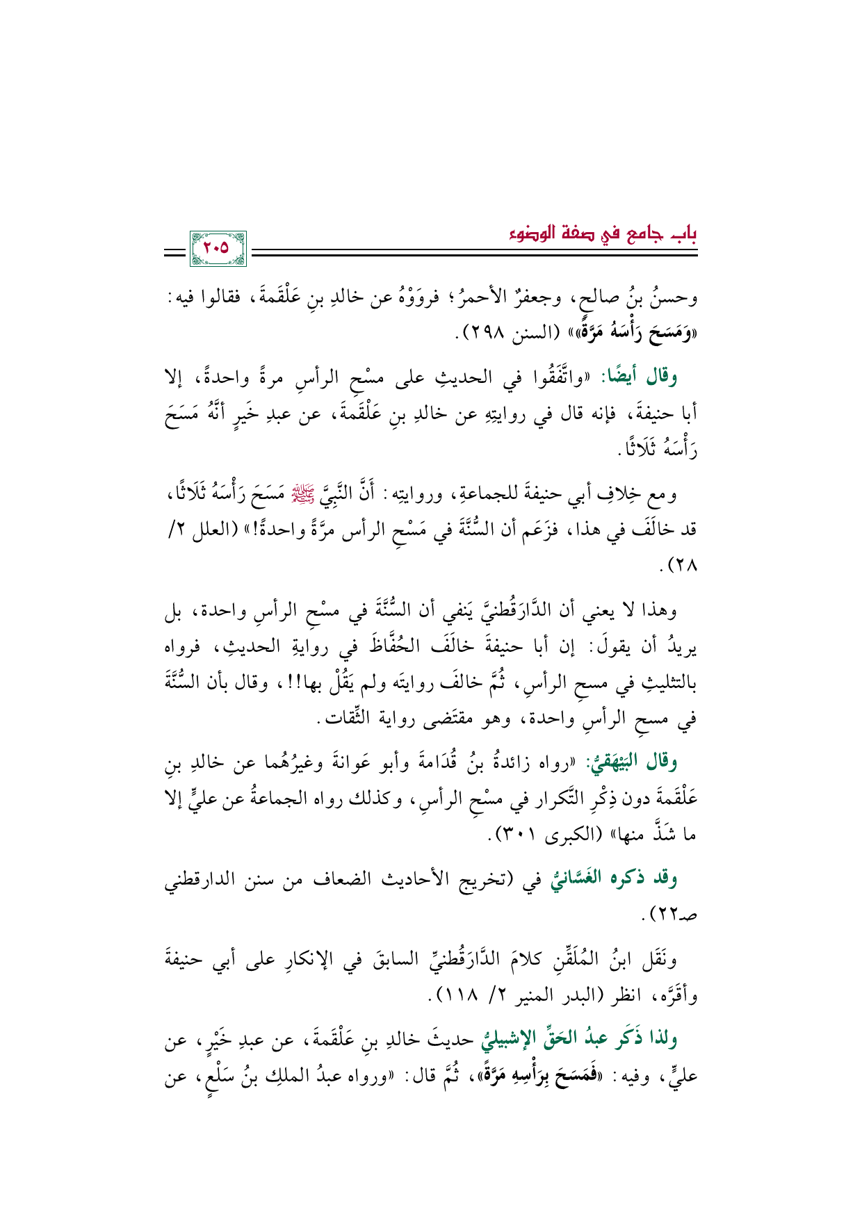 وهذا لا يعني أن الدَّارَقُطنيَّ يَنفي أن السُّنَّةَ في مسْحِ الرأسِ واحدة، بل يريدُ أن يقولَ: إن أبا حنيفةَ خالَفَ الحُفَّاظَ في روايةِ الحديثِ، فرواه بالتثليثِ في مسحِ الرأسِ، ثُمَّ خالفَ روايتَه ولم يَقُلْ بها! ! ، وقال بأن السُّنَّةَ في مسحِ الرأسِ واحدة، وهو مقتَضى رواية الثِّقات.
