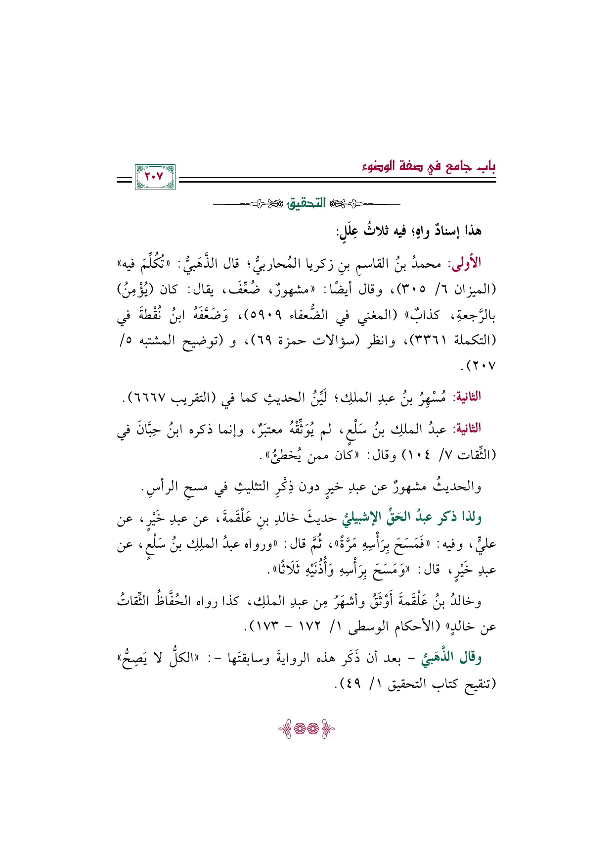 ولذا ذكر عبدُ الحَقِّ الإشبيليُّ حديثَ خالدِ بنِ عَلْقَمةَ، عن عبدِ خَيْرٍ، عن عليٍّ، وفيه: ((فَمَسَحَ بِرَأْسِهِ مَرَّةً))، ثُمَّ قال: "ورواه عبدُ الملِكِ بنُ سَلْعٍ، عن عبدِ خَيْرٍ، قال: ((وَمَسَحَ بِرَأْسِهِ وَأُذُنَيْهِ ثَلَاثًا)).