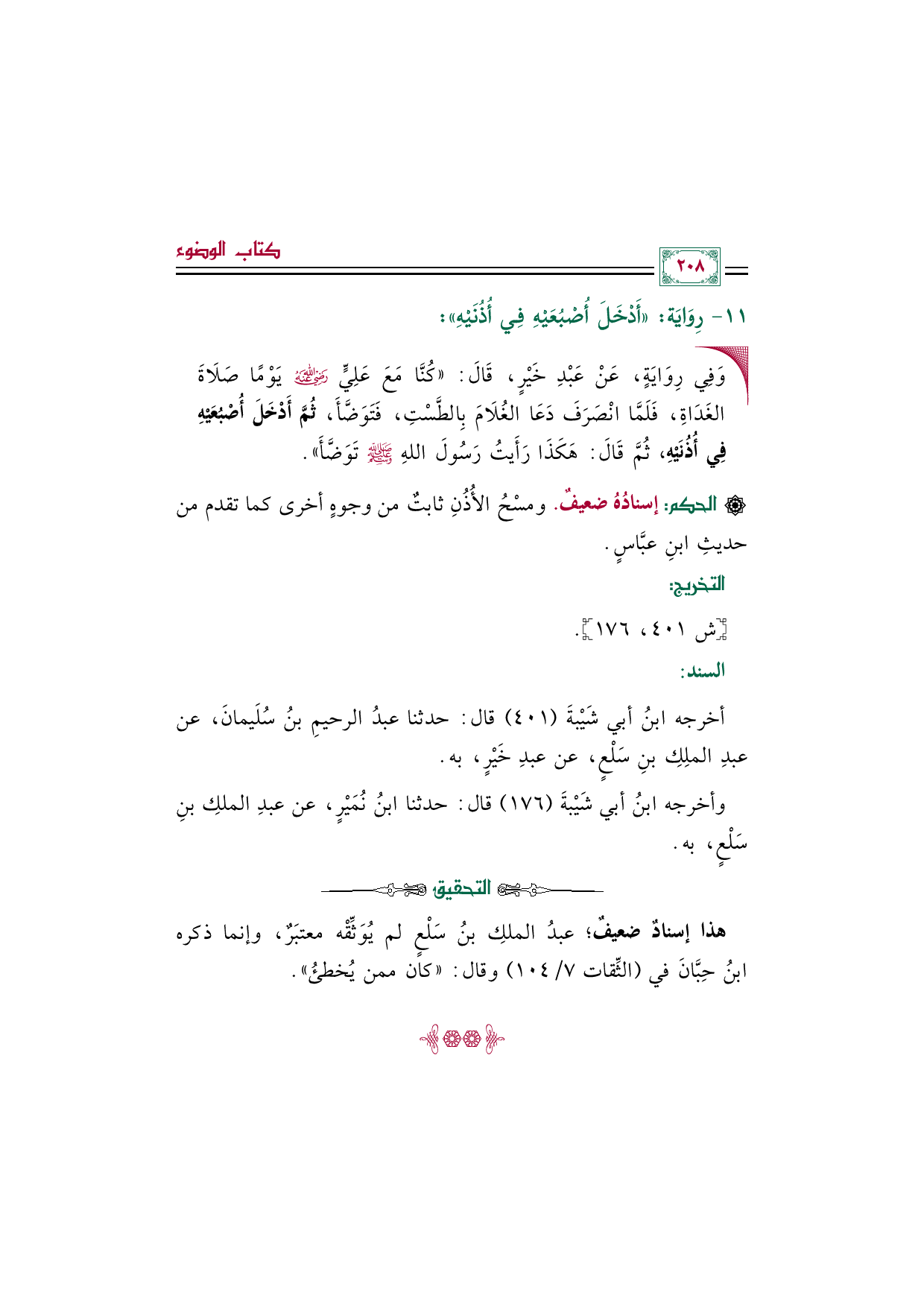 • وَفِي رِوَايَةٍ، عَنْ عَبْدِ خَيْرٍ، قَالَ: ((كُنَّا مَعَ عَلِيٍّ رضي الله عنه يَوْمًا صَلَاةَ الغَدَاةِ، فَلَمَّا انْصَرَفَ دَعَا الغُلَامَ بِالطَّسْتِ، فَتَوَضَّأَ، ثُمَّ أَدْخَلَ أُصْبُعَيْهِ فِي أُذُنَيْهِ، ثُمَّ قَالَ: هَكَذَا رَأَيتُ رَسُولَ اللهِ صلى الله عليه وسلم تَوَضَّأَ)).