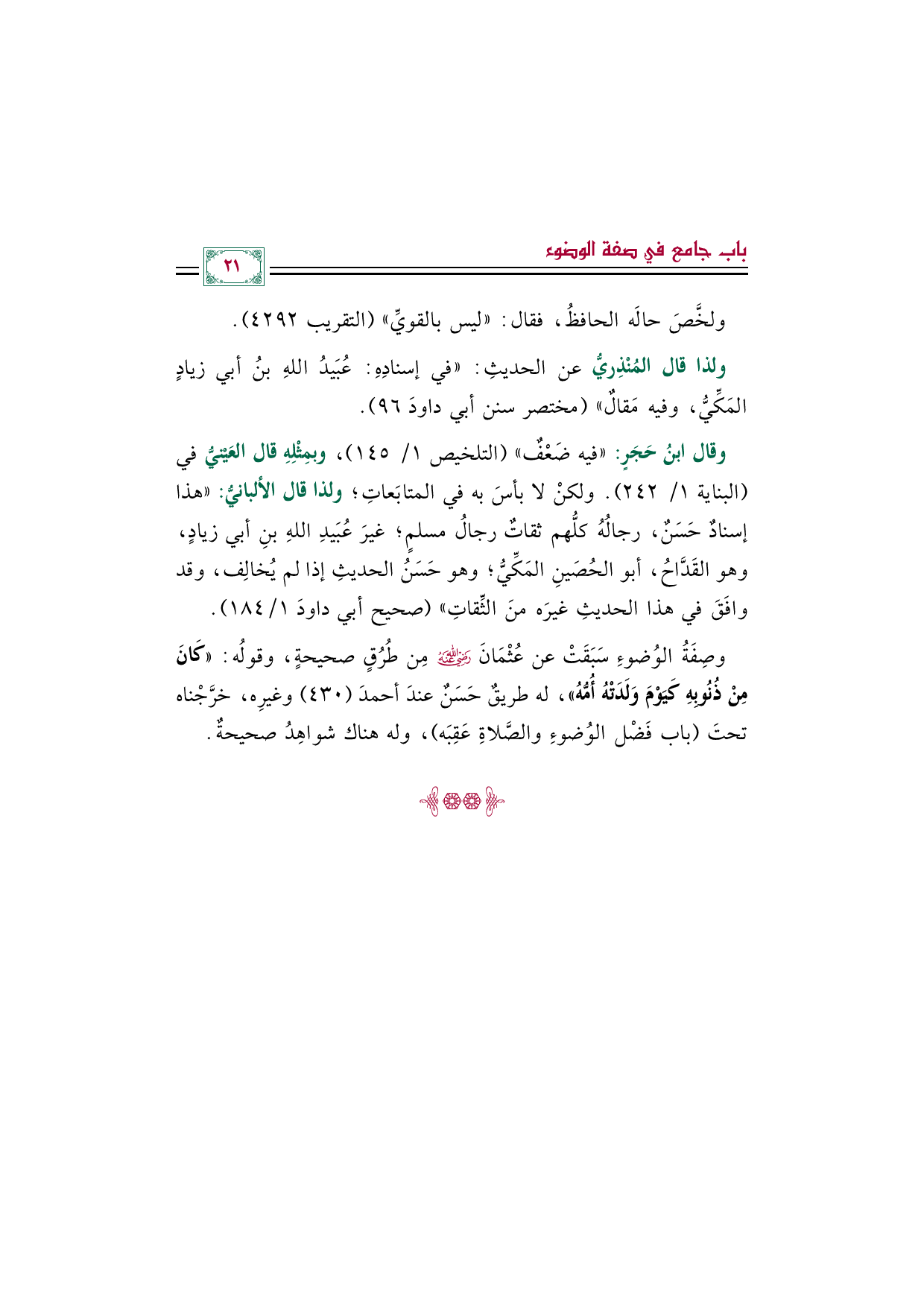 ولذا قال المُنْذِريُّ عن الحديثِ: "في إسنادِهِ: عُبَيدُ اللهِ بنُ أبي زيادٍ المَكِّيُّ، وفيه مَقالٌ" (مختصر سنن أبي داودَ ٩٦).