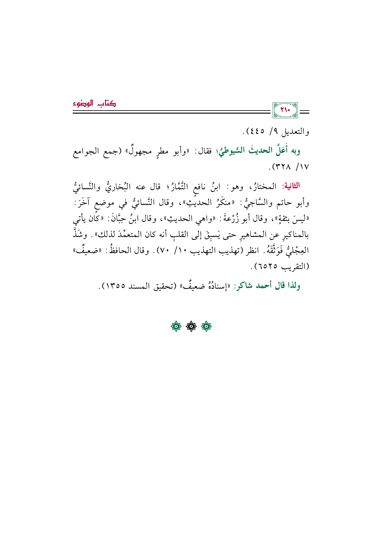 الثانية: المختارُ، وهو: ابنُ نافعٍ التَّمَّارُ؛ قال عنه البُخاريُّ والنَّسائيُّ وأبو حاتم والسَّاجيُّ: "منكَرُ الحديثِ"، وقال النَّسائيُّ في موضعٍ آخَرَ: "ليسَ بثقةٍ"، وقال أبو زُرْعةَ: "واهي الحديثِ"، وقال ابنُ حِبَّانَ: "كان يأتي بالمناكيرِ عن المشاهيرِ حتى يَسبِقَ إلى القلبِ أنه كان المتعمِّدَ لذلك". وشَذَّ العِجْليُّ فَوَثَّقَهُ. انظر (تهذيب التهذيب ١٠/ ٧٠). وقال الحافظُ: "ضعيفٌ" (التقريب ٦٥٢٥).