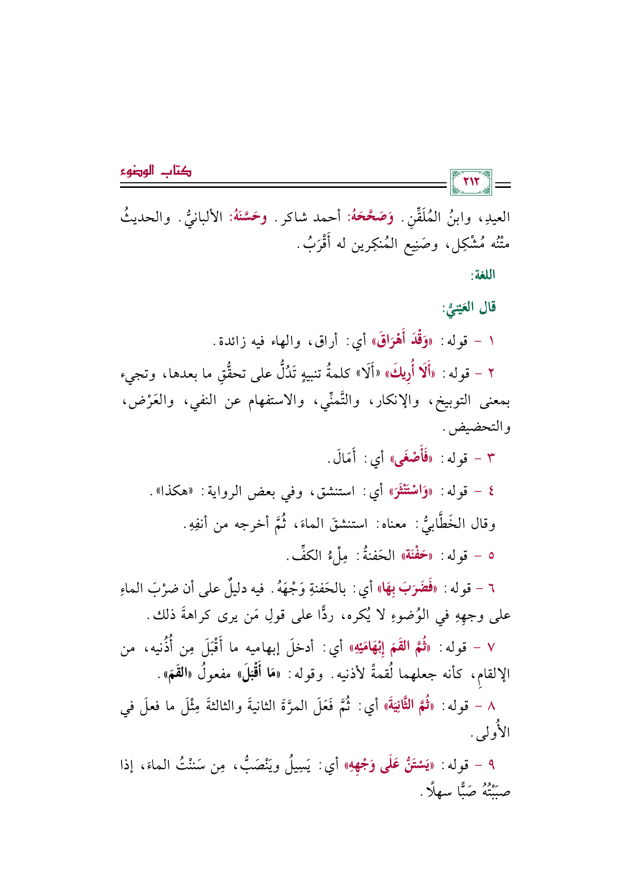 وقال الخَطَّابيُّ: معناه: استنشقَ الماءَ، ثُمَّ أخرجه من أنفِهِ.