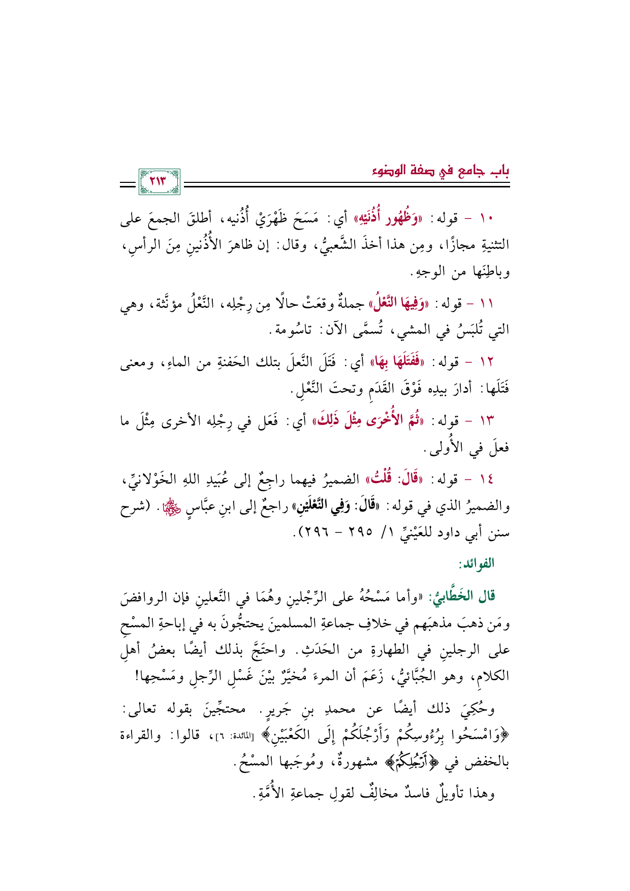 قال الخَطَّابيُّ: ((وأما مَسْحُهُ على الرِّجْلينِ وهُمَا في النَّعلينِ فإن الروافضَ ومَن ذهبَ مذهبَهم في خلافِ جماعةِ المسلمينَ يحتجُّونَ به في إباحةِ المسْحِ على الرجلينِ في الطهارةِ من الحَدَثِ. واحتَجَّ بذلك أيضًا بعضُ أهلِ الكلامِ، وهو الجُبَّائيُّ، زَعَمَ أن المرءَ مُخيَّرٌ بيْنَ غَسْلِ الرِّجلِ ومَسْحِها!