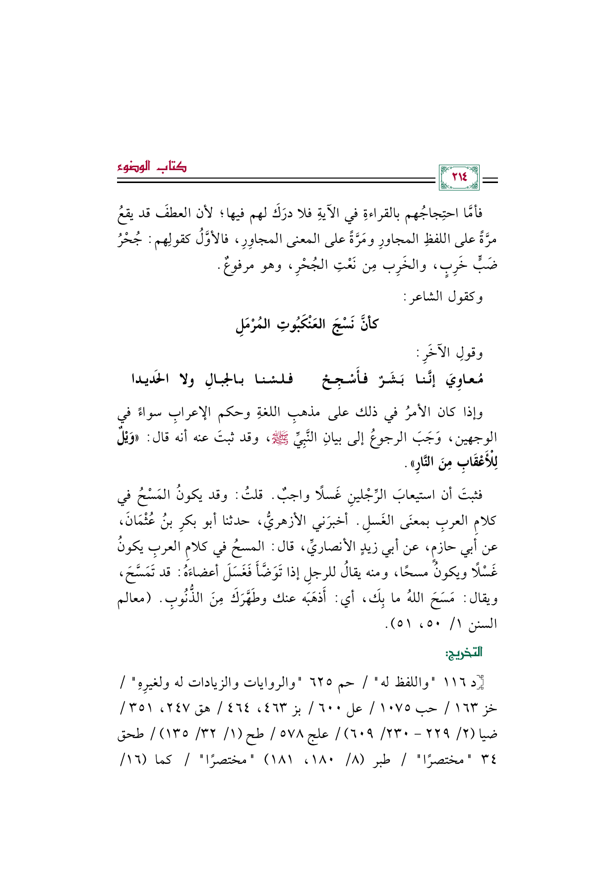 وإذا كان الأمرُ في ذلك على مذهبِ اللغةِ وحكم الإعرابِ سواءً في الوجهين، وَجَبَ الرجوعُ إلى بيانِ النَّبِيِّ صلى الله عليه وسلم، وقد ثبتَ عنه أنه قال: ((وَيْلٌ لِلْأَعْقَابِ مِنَ النَّارِ)).