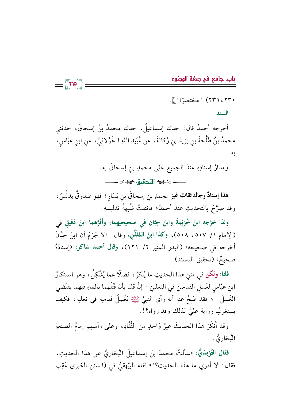قلنا: ولكن في متنِ هذا الحديثِ ما يُنكَرُ، فضلًا عما يُشْكِلُ، وهو استنكارُ ابنِ عبَّاسٍ لغَسلِ القدمينِ في النعلينِ -إنْ قلنا بأن فَتْلَهما بالماءِ فيهما يقتَضي الغَسلَ-؛ فقد صَحَّ عنه أنه رَأى النبيَّ صلى الله عليه وسلم يَغْسِلُ قدميه في نعليه، فكيف يستغربُ رواية عليٍّ لذلك وقد رواه؟ ! .