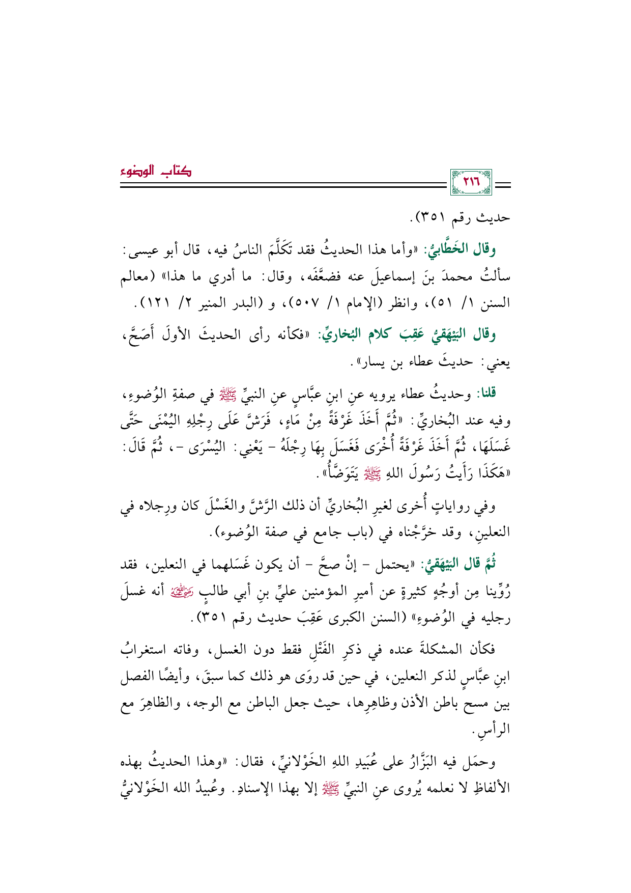 ثُمَّ قال البَيْهَقيُّ: "يحتمل -إنْ صحَّ- أن يكون غَسَلهما في النعلين، فقد رُوِّينا مِن أوجُهٍ كثيرةٍ عن أميرِ المؤمنين عليِّ بنِ أبي طالبٍ رضي الله عنه أنه غسلَ رجليه في الوُضوءِ" (السنن الكبرى عَقِبَ حديث رقم ٣٥١).