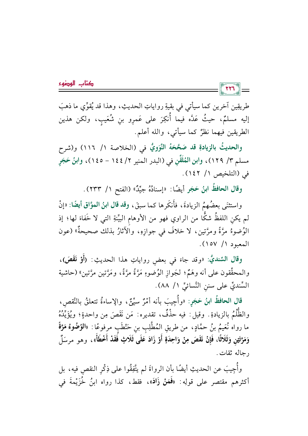 واستثنَى بعضُهمُ الزيادةَ، فأَنكَرها كما سبقَ، وقد قال ابنُ الموَّاق أيضًا: "إنْ لم يكنِ اللفظُ شكًّا من الراوي فهو من الأوهامِ البيِّنةِ التي لا خَفاءَ لها؛ إذ الوُضوءُ مرَّةً ومرَّتين، لا خلافَ في جوازِهِ، والآثارُ بذلك صحيحةٌ" (عون المعبود ١/ ١٥٧).