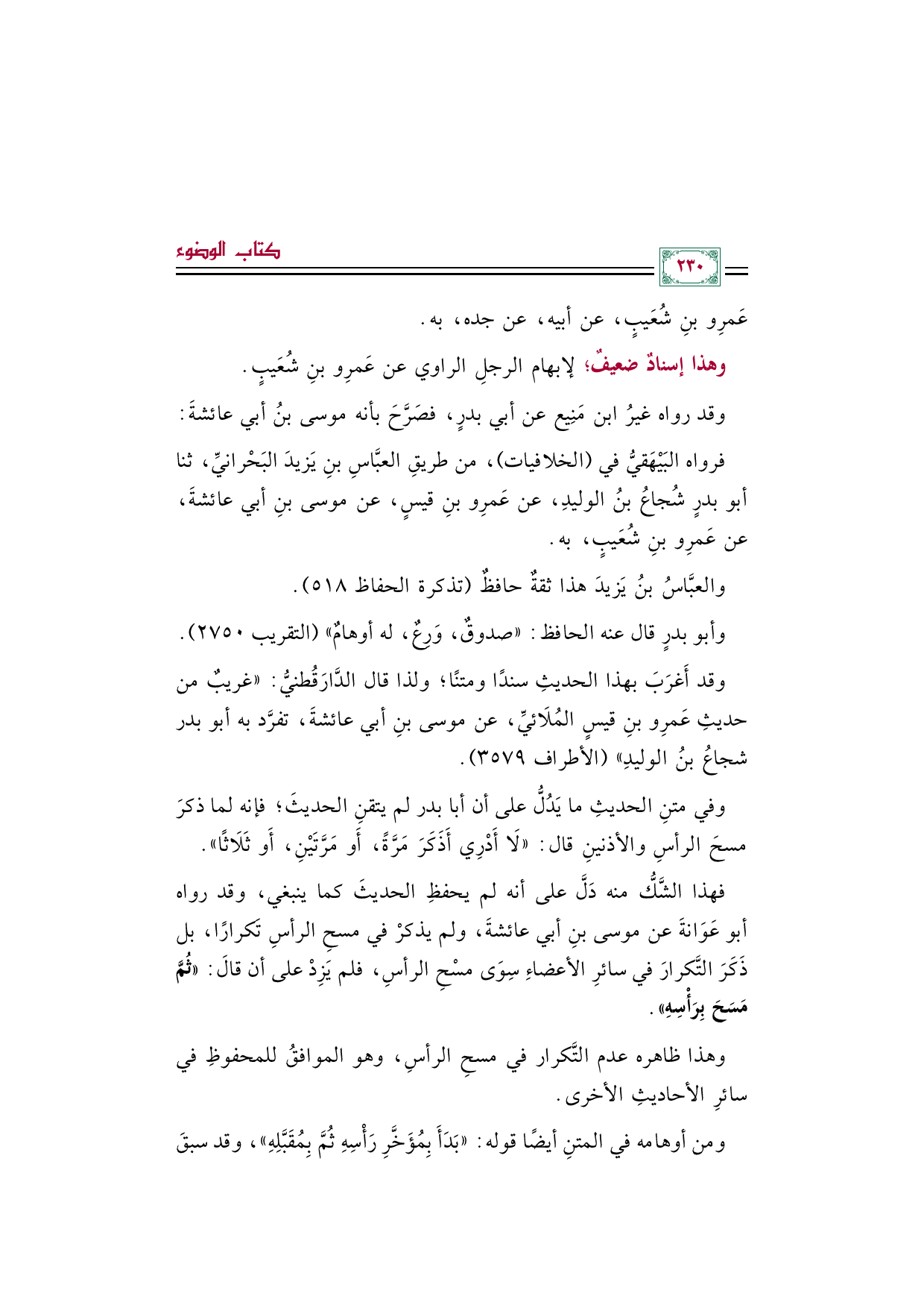 فهذا الشَّكُّ منه دَلَّ على أنه لم يحفظِ الحديثَ كما ينبغي، وقد رواه أبو عَوَانةَ عن موسى بنِ أبي عائشةَ، ولم يذكرْ في مسحِ الرأسِ تَكرارًا، بل ذَكَرَ التَّكرارَ في سائرِ الأعضاءِ سِوَى مسْحِ الرأسِ، فلم يَزِدْ على أن قالَ: ((ثُمَّ مَسَحَ بِرَأْسِهِ)).