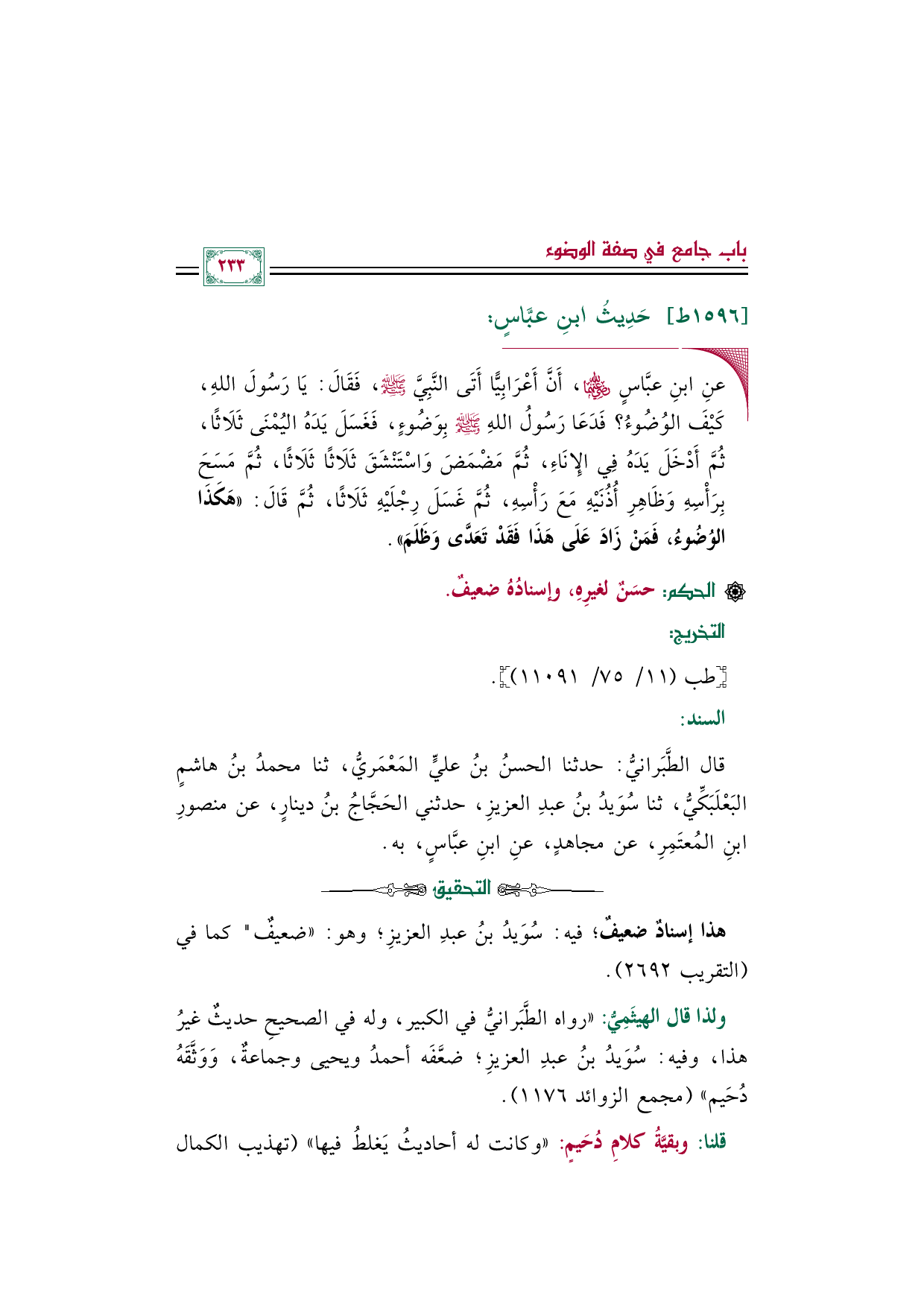 قال الطَّبَرانيُّ: حدثنا الحسنُ بنُ عليٍّ المَعْمَريُّ، ثنا محمدُ بنُ هاشمٍ البَعْلَبَكِّيُّ، ثنا سُوَيدُ بنُ عبدِ العزيزِ، حدثني الحَجَّاجُ بنُ دينارٍ، عن منصورِ بنِ المُعتَمِرِ، عن مجاهدٍ، عنِ ابنِ عبَّاسٍ، به.