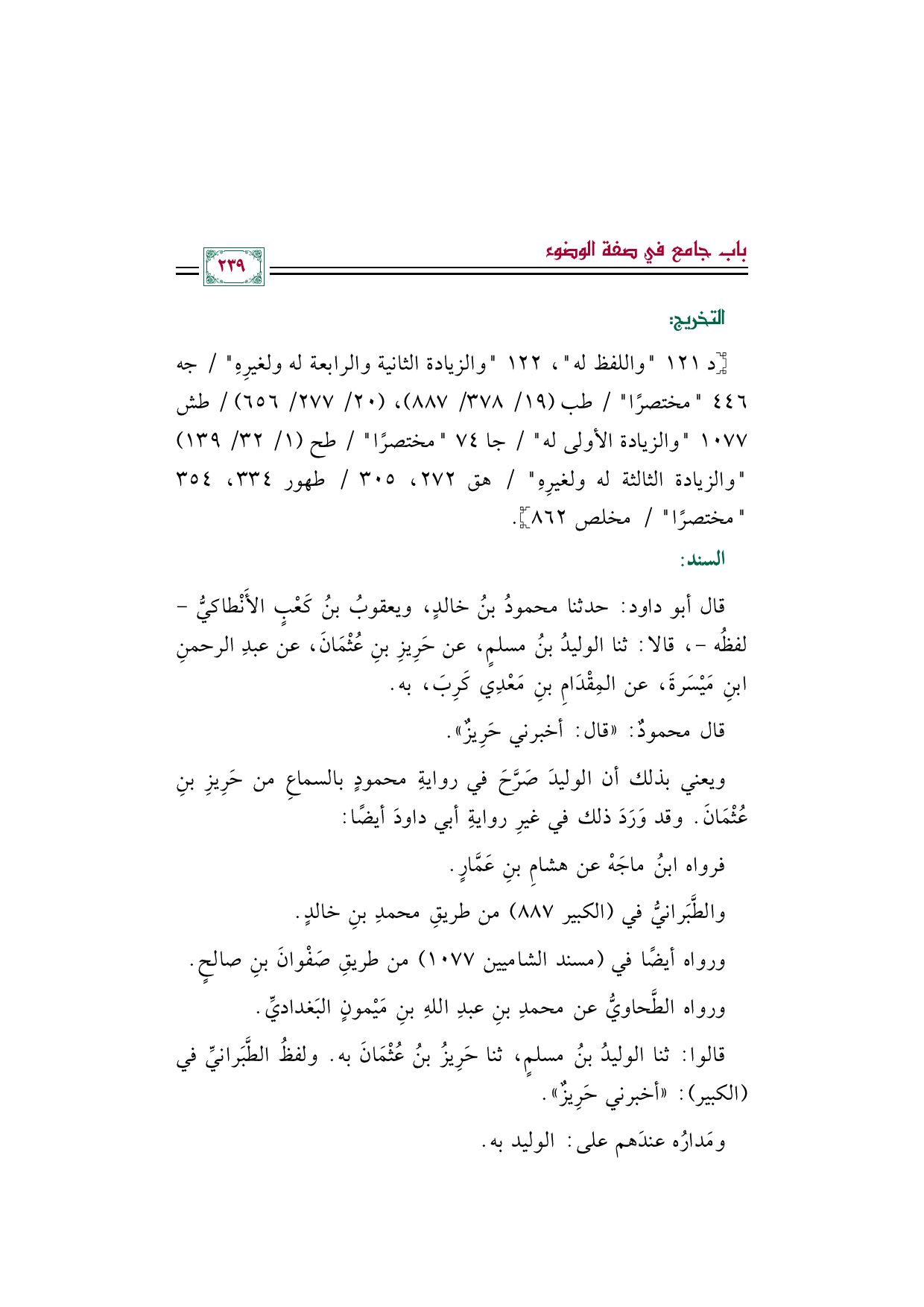 [د ١٢١ (واللفظ له)، ١٢٢ (والزيادة الثانية والرابعة له ولغيرِهِ) / جه ٤٤٦ مختصرًا/ طب (١٩/ ٣٧٨/ ٨٨٧)، (٢٠/ ٢٧٧/ ٦٥٦) / طش ١٠٧٧ (والزيادة الأولى له) / جا ٧٤ مختصرًا/ طح (١/ ٣٢/ ١٣٩) (والزيادة الثالثة له ولغيرِهِ) / هق ٢٧٢، ٣٠٥/ طهور ٣٣٤، ٣٥٤ مختصرًا/ مخلص ٨٦٢].