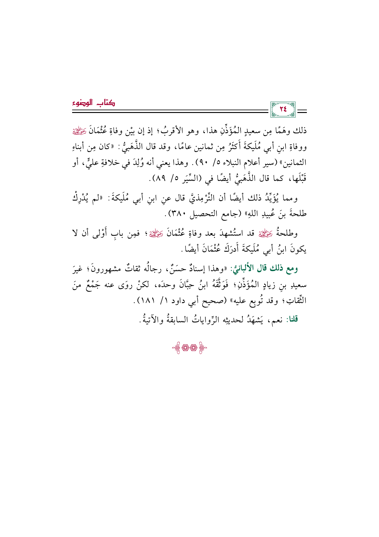 ذلك وهَمًا مِن سعيدٍ المُؤَذِّنِ هذا، وهو الأقربُ؛ إذ إن بيْن وفاةِ عُثْمَانَ رضي الله عنه ووفاةِ ابنِ أبي مُلَيكةَ أَكثَرُ مِن ثمانين عامًا، وقد قال الذَّهَبيُّ: "كان مِن أبناءِ الثمانين" (سير أعلام النبلاء ٥/ ٩٠). وهذا يعني أنه وُلِدَ في خلافةِ عليٍّ، أو قَبْلَها، كما قال الذَّهَبيُّ أيضًا في (السِّيَر ٥/ ٨٩).