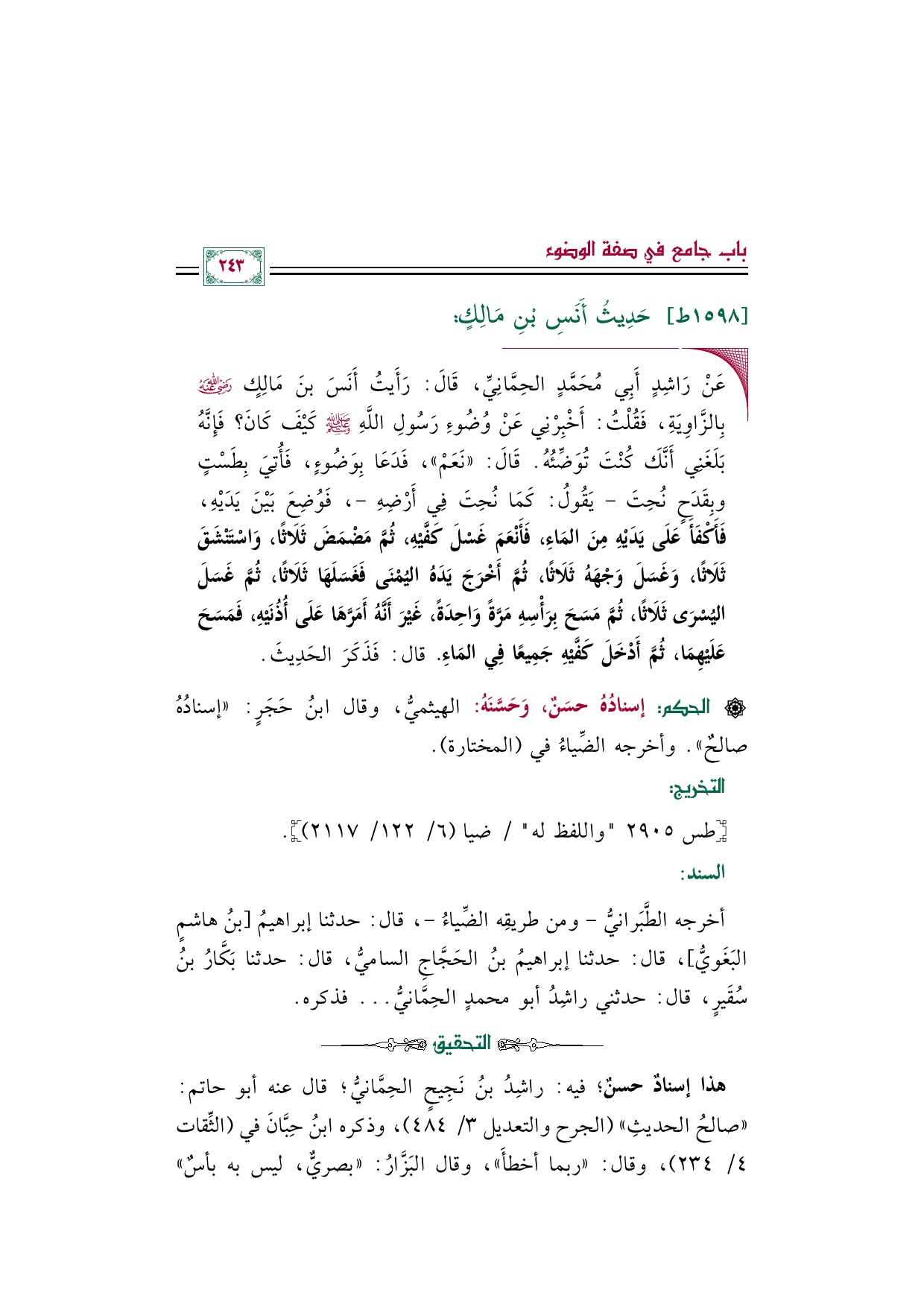 هذا إسنادٌ حسنٌ؛ فيه: راشِدُ بنُ نَجِيحٍ الحِمَّانيُّ؛ قال عنه أبو حاتم: "صالحُ الحديثِ" (الجرح والتعديل ٣/ ٤٨٤)، وذكره ابنُ حِبَّانَ في (الثِّقات ٤/ ٢٣٤)، وقال: "ربما أخطأَ"، وقال البَزَّارُ: "بصريٌّ، ليس به بأسٌ"