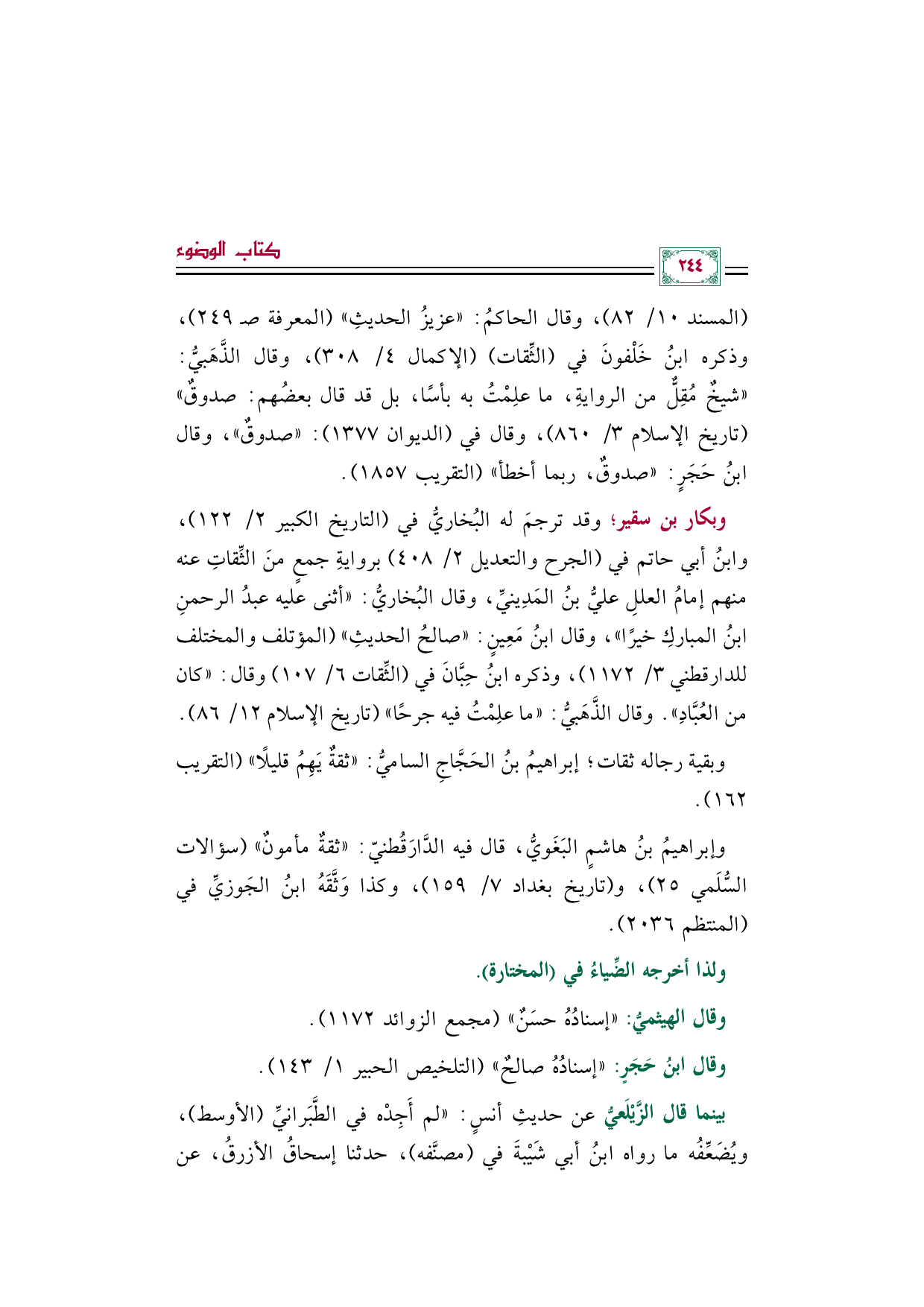 وبكار بن سقير؛ وقد ترجمَ له البُخاريُّ في (التاريخ الكبير ٢/ ١٢٢)، وابنُ أبي حاتم في (الجرح والتعديل ٢/ ٤٠٨) بروايةِ جمعٍ منَ الثِّقاتِ عنه منهم إمامُ العللِ عليُّ بنُ المَدِينيِّ، وقال البُخاريُّ: "أثنى عليه عبدُ الرحمنِ بنُ المباركِ خيرًا"، وقال ابنُ مَعِينٍ: "صالحُ الحديثِ" (المؤتلف والمختلف للدارقطني ٣/ ١١٧٢)، وذكره ابنُ حِبَّانَ في (الثِّقات ٦/ ١٠٧) وقال: "كان من العُبَّادِ". وقال الذَّهَبيُّ: "ما علِمْتُ فيه جرحًا" (تاريخ الإسلام ١٢/ ٨٦).