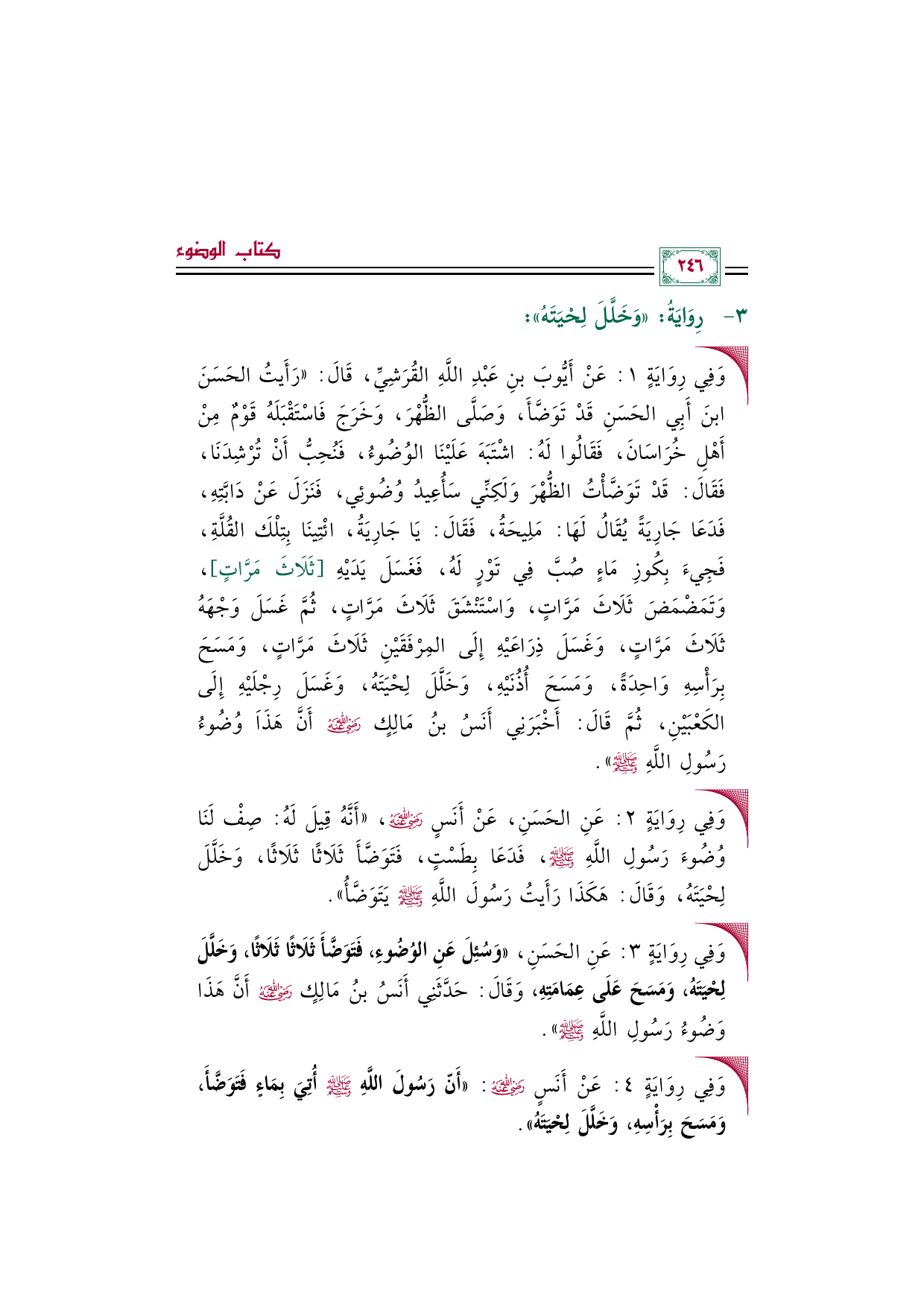 • وَفِي رِوَايَةٍ ٣: عَنِ الحَسَنِ، ((وَسُئِلَ عَنِ الوُضُوءِ، فَتَوَضَّأَ ثَلَاثًا ثَلَاثًا، وَخَلَّلَ لِحْيَتَهُ، وَمَسَحَ عَلَى عِمَامَتِهِ، وَقَالَ: حَدَّثَنِي أَنَسُ بنُ مَالِكٍ رضي الله عنه أَنَّ هَذَا وَضُوءُ رَسُولِ اللَّهِ صلى الله عليه وسلم)).