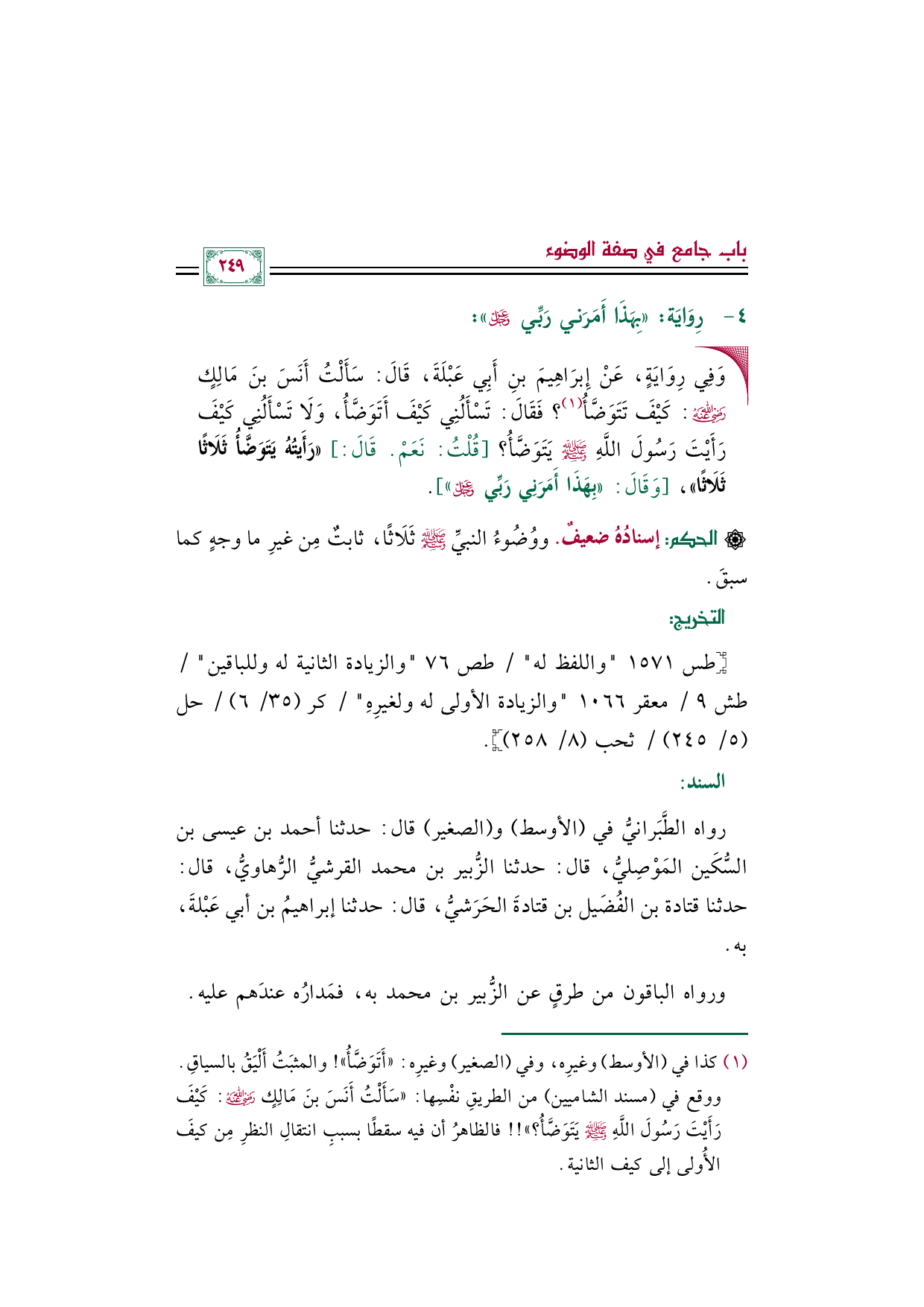 (¬١) ((كذا في (الأوسط) وغيرِه، وفي (الصغير) وغيرِه: ((أَتَوَضَّأُ))! والمثبَتُ أَلْيَقُ بالسياقِ. ووقع في (مسند الشاميين) من الطريقِ نفْسِها: ((سَأَلْتُ أَنَسَ بنَ مَالِكٍ رضي الله عنه: كَيْفَ رَأَيْتَ رَسُولَ اللَّهِ صلى الله عليه وسلم يَتَوَضَّأُ؟))!! فالظاهرُ أن فيه سقطًا بسببِ انتقالِ النظرِ مِن كيفَ الأُولى إلى كيف الثانية.