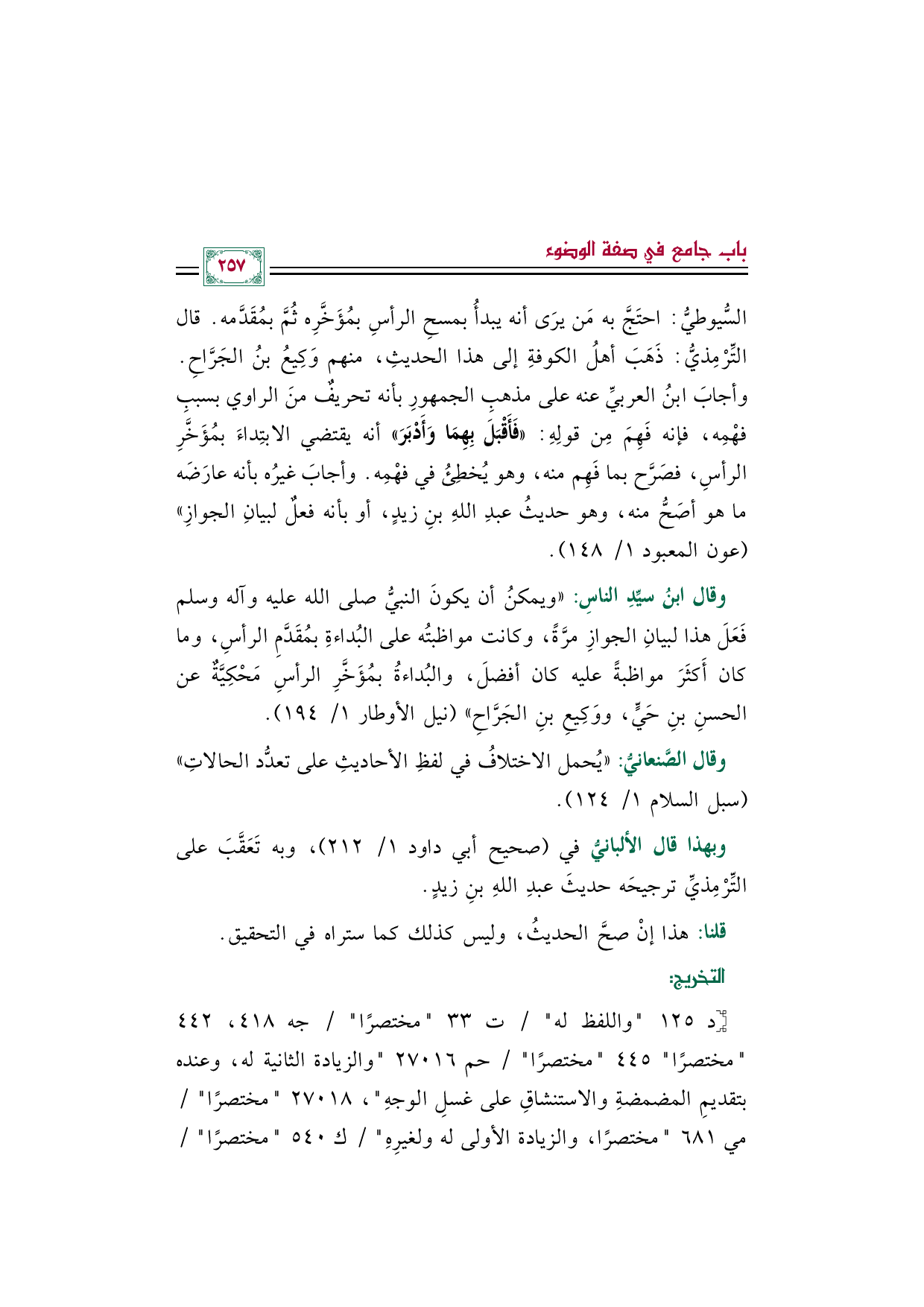 السُّيوطيُّ: احتَجَّ به مَن يرَى أنه يبدأُ بمسحِ الرأسِ بمُؤَخَّرِه ثُمَّ بمُقَدَّمه. قال التِّرْمِذيُّ: ذَهَبَ أهلُ الكوفةِ إلى هذا الحديثِ، منهم وَكِيعُ بنُ الجَرَّاحِ. وأجابَ ابنُ العربيِّ عنه على مذهبِ الجمهورِ بأنه تحريفٌ منَ الراوي بسببِ فهْمِه، فإنه فَهِمَ مِن قولِهِ: ((فَأَقْبَلَ بِهِمَا وَأَدْبَرَ)) أنه يقتضي الابتِداءَ بمُؤَخَّرِ الرأسِ، فصَرَّح بما فَهِم منه، وهو يُخطِئُ في فهْمِه. وأجابَ غيرُه بأنه عارَضَه ما هو أصَحُّ منه، وهو حديثُ عبدِ اللهِ بنِ زيدٍ، أو بأنه فعلٌ لبيانِ الجوازِ" (عون المعبود ١/ ١٤٨).