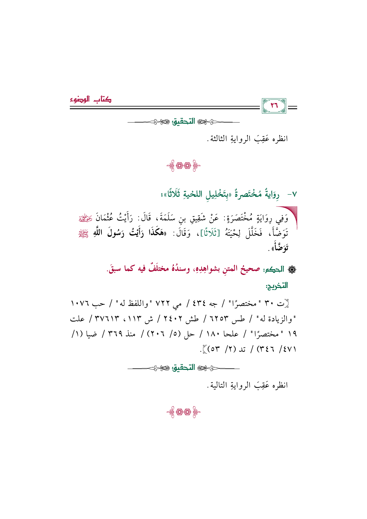 • وَفِي رِوَايَةٍ مُخْتَصَرَةٍ: عَنْ شَقِيقِ بنِ سَلَمَةَ، قَالَ: رَأَيْتُ عُثْمَانَ رضي الله عنه تَوَضَّأَ، فَخَلَّلَ لِحْيَتَهُ [ثَلَاثًا]، وَقَالَ: «هَكَذَا رَأَيْتُ رَسُولَ اللَّهِ صلى الله عليه وسلم تَوَضَّأَ».