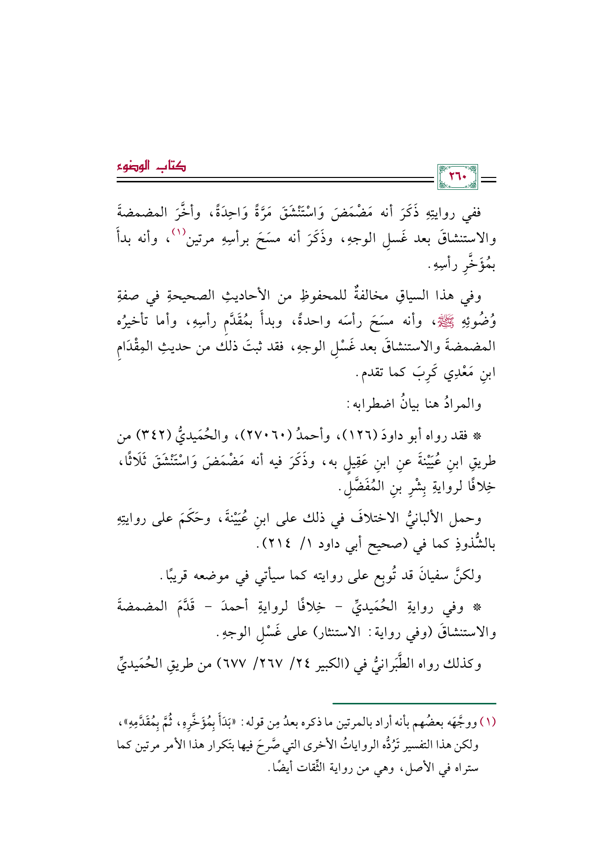 * وفي روايةِ الحُمَيديِّ -خِلافًا لروايةِ أحمدَ- قَدَّمَ المضمضةَ والاستنشاقَ (وفي رواية: الاستنثار) على غَسْلِ الوجهِ.