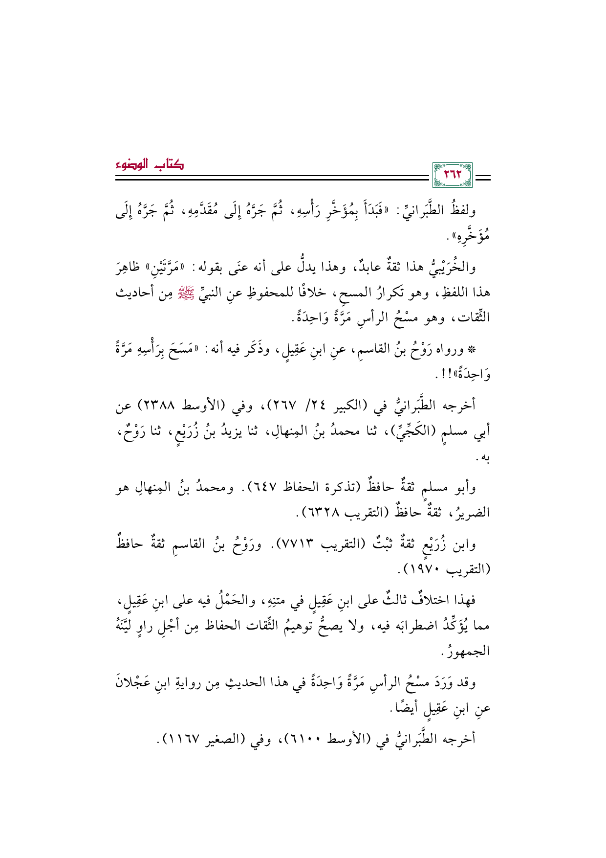 * ورواه رَوْحُ بنُ القاسمِ، عنِ ابنِ عَقِيلٍ، وذَكَر فيه أنه: ((مَسَحَ بِرَأْسِهِ مَرَّةً وَاحِدَةً))! ! .