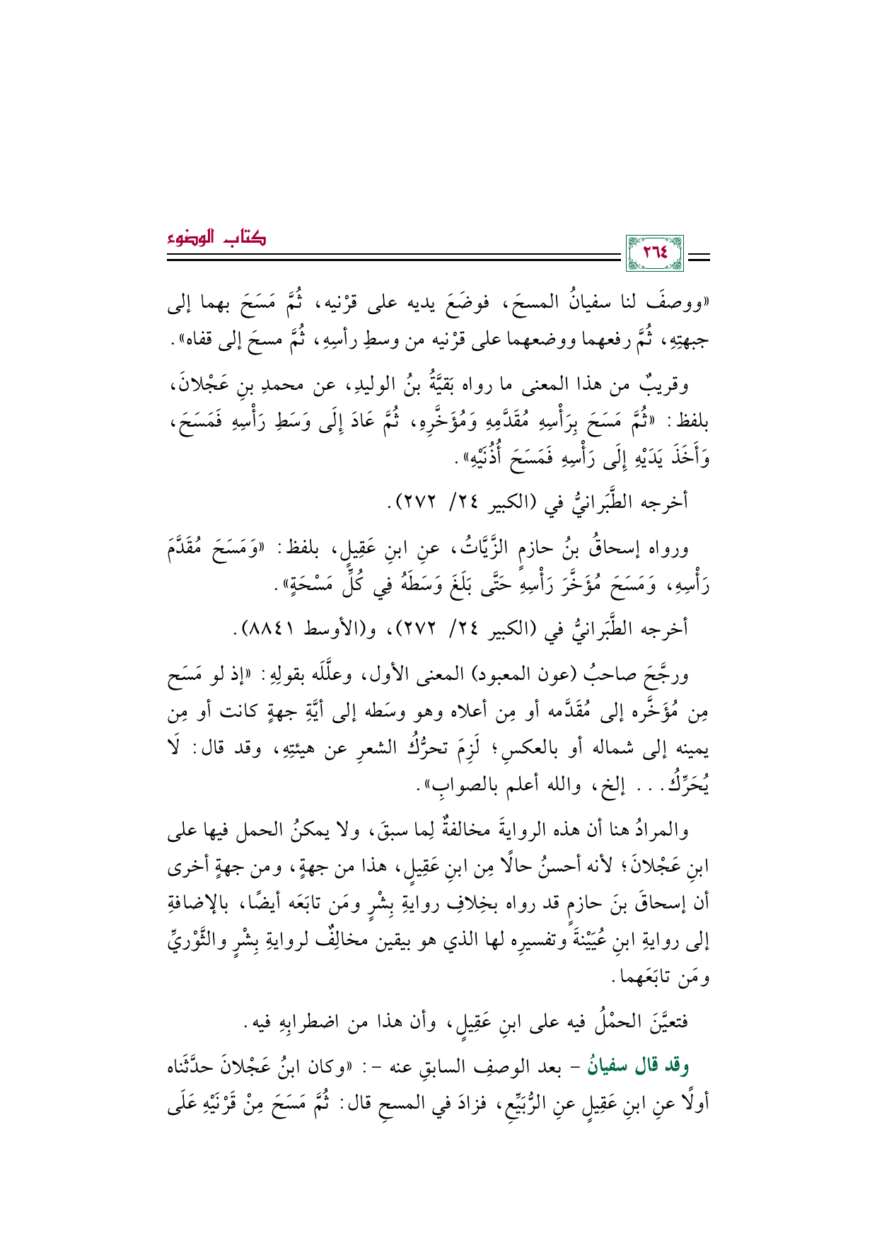 "ووصفَ لنا سفيانُ المسحَ، فوضَعَ يديه على قرْنيه، ثُمَّ مَسَحَ بهما إلى جبهتِهِ، ثُمَّ رفعهما ووضعهما على قرْنيه من وسطِ رأسِهِ، ثُمَّ مسحَ إلى قفاه".