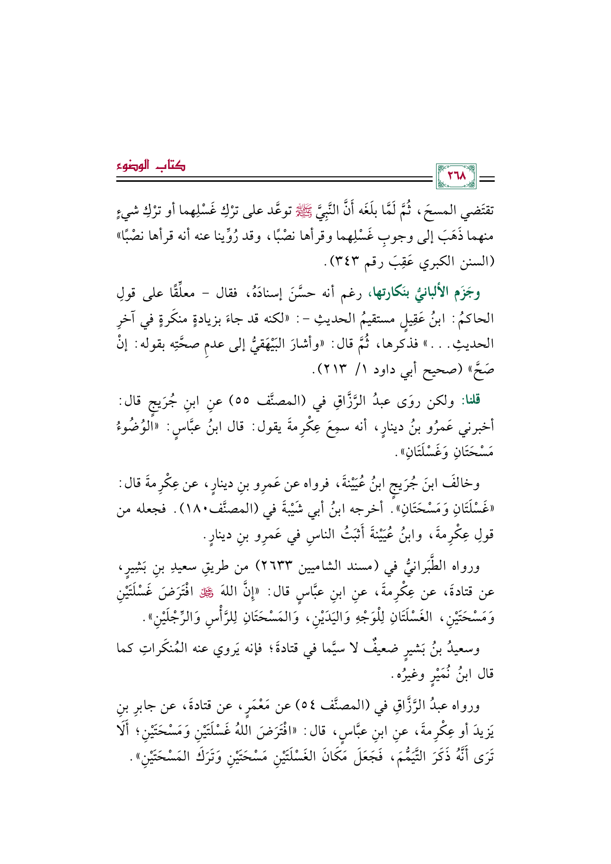 قلنا: ولكن روَى عبدُ الرَّزَّاقِ في (المصنَّف ٥٥) عنِ ابنِ جُرَيجٍ قال: أخبرني عَمرُو بنُ دينارٍ، أنه سمِعَ عِكْرِمةَ يقول: قال ابنُ عبَّاسٍ: ((الوُضُوءُ مَسْحَتَانِ وَغَسْلَتَانِ)).