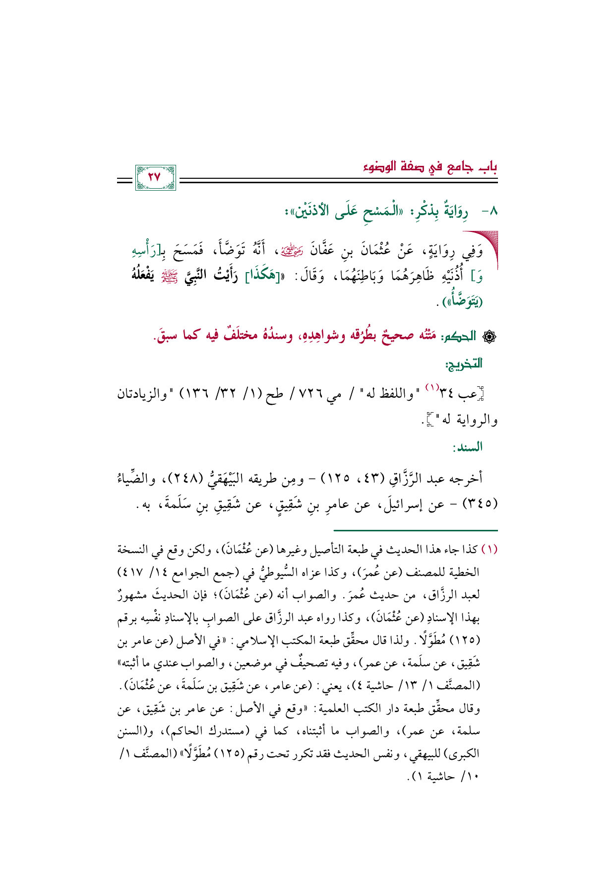 (¬١) كذا جاء هذا الحديث في طبعة التأصيل وغيرها (عن عُثْمَانَ)، ولكن وقع في النسخة الخطية للمصنف (عن عُمرَ)، وكذا عزاه السُّيوطيُّ في (جمع الجوامع ١٤/ ٤١٧) لعبد الرزَّاق، من حديث عُمرَ. والصواب أنه (عن عُثْمَانَ)؛ فإن الحديثَ مشهورٌ بهذا الإسنادِ (عن عُثْمَانَ)، وكذا رواه عبد الرزَّاق على الصوابِ بالإسنادِ نفْسِه برقم (١٢٥) مُطَوَّلًا. ولذا قال محقِّق طبعة المكتب الإسلامي: ((في الأصل (عن عامر بن شَقِيق، عن سلَمة، عن عمر)، وفيه تصحيفٌ في موضعين، والصواب عندي ما أثبته)) (المصنَّف ١/ ١٣/ حاشية ٤)، يعني: (عن عامر، عن شَقِيق بن سَلَمةَ، عن عُثْمَانَ). وقال محقِّق طبعة دار الكتب العلمية: ((وقع في الأصل: عن عامر بن شَقِيق، عن سلمة، عن عمر)، والصواب ما أثبتناه، كما في مستدرك الحاكم، والسنن الكبرى للبيهقي، ونفس الحديث فقد تكرر تحت رقم (١٢٥) مُطَوَّلًا)) (المصنَّف ١/ ١٠/ حاشية ١).