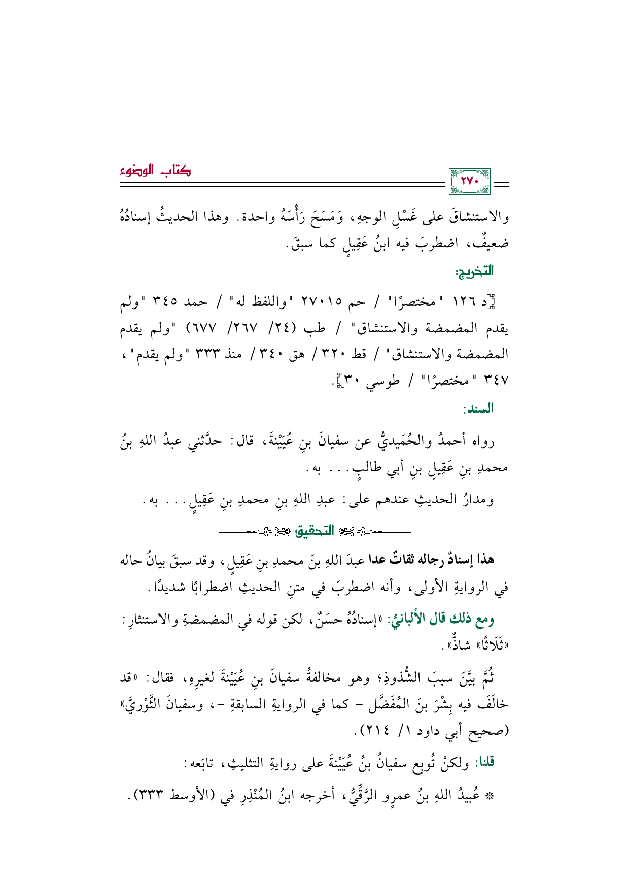ومع ذلك قال الألبانيُّ: "إسنادُهُ حسَنٌ، لكن قوله في المضمضةِ والاستنثارِ: «ثَلَاثًا» شاذٌّ".