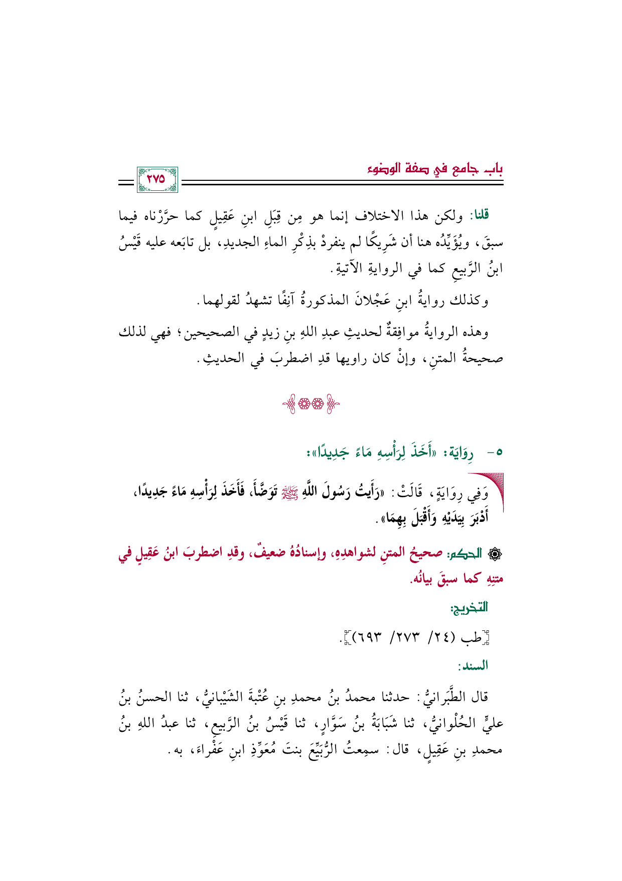 قلنا: ولكن هذا الاختلاف إنما هو مِن قِبَلِ ابنِ عَقِيلٍ كما حرَّرْناه فيما سبقَ، ويُؤَيِّدُه هنا أن شَرِيكًا لم ينفردْ بذِكْرِ الماءِ الجديدِ، بل تابَعه عليه قَيْسُ بنُ الرَّبيعِ كما في الروايةِ الآتيةِ.