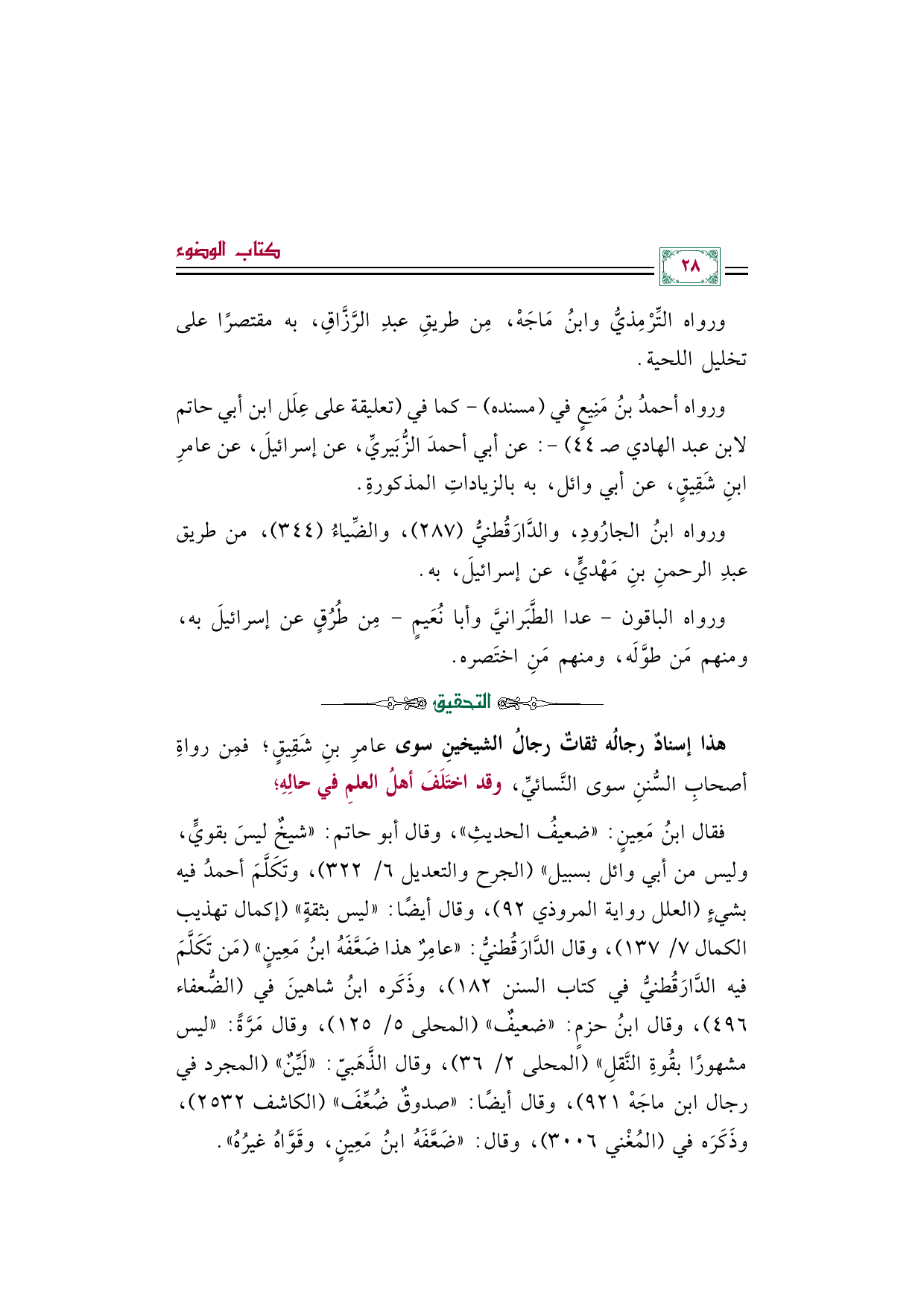فقال ابنُ مَعِينٍ: "ضعيفُ الحديثِ"، وقال أبو حاتم: "شيخٌ ليسَ بقويٍّ، وليس من أبي وائل بسبيل" (الجرح والتعديل ٦/ ٣٢٢)، وتَكَلَّمَ أحمدُ فيه بشيءٍ (العلل رواية المروذي ٩٢)، وقال أيضًا: "ليس بثقةٍ" (إكمال تهذيب الكمال ٧/ ١٣٧)، وقال الدَّارَقُطنيُّ: "عامِرٌ هذا ضَعَّفَهُ ابنُ مَعِينٍ" (مَن تَكَلَّمَ فيه الدَّارَقُطنيُّ في كتاب السنن ١٨٢)، وذَكَره ابنُ شاهينَ في (الضُّعفاء ٤٩٦)، وقال ابنُ حزمٍ: "ضعيفٌ" (المحلى ٥/ ١٢٥)، وقال مَرَّةً: "ليس مشهورًا بقُوةِ النَّقلِ" (المحلى ٢/ ٣٦)، وقال الذَّهَبيّ: "لَيِّنٌ" (المجرد في رجال ابن ماجَهْ ٩٢١)، وقال أيضًا: "صدوقٌ ضُعِّفَ" (الكاشف ٢٥٣٢)، وذَكَرَه في (المُغْني ٣٠٠٦)، وقال: "ضَعَّفَهُ ابنُ مَعِينٍ، وقَوَّاهُ غيرُهُ".