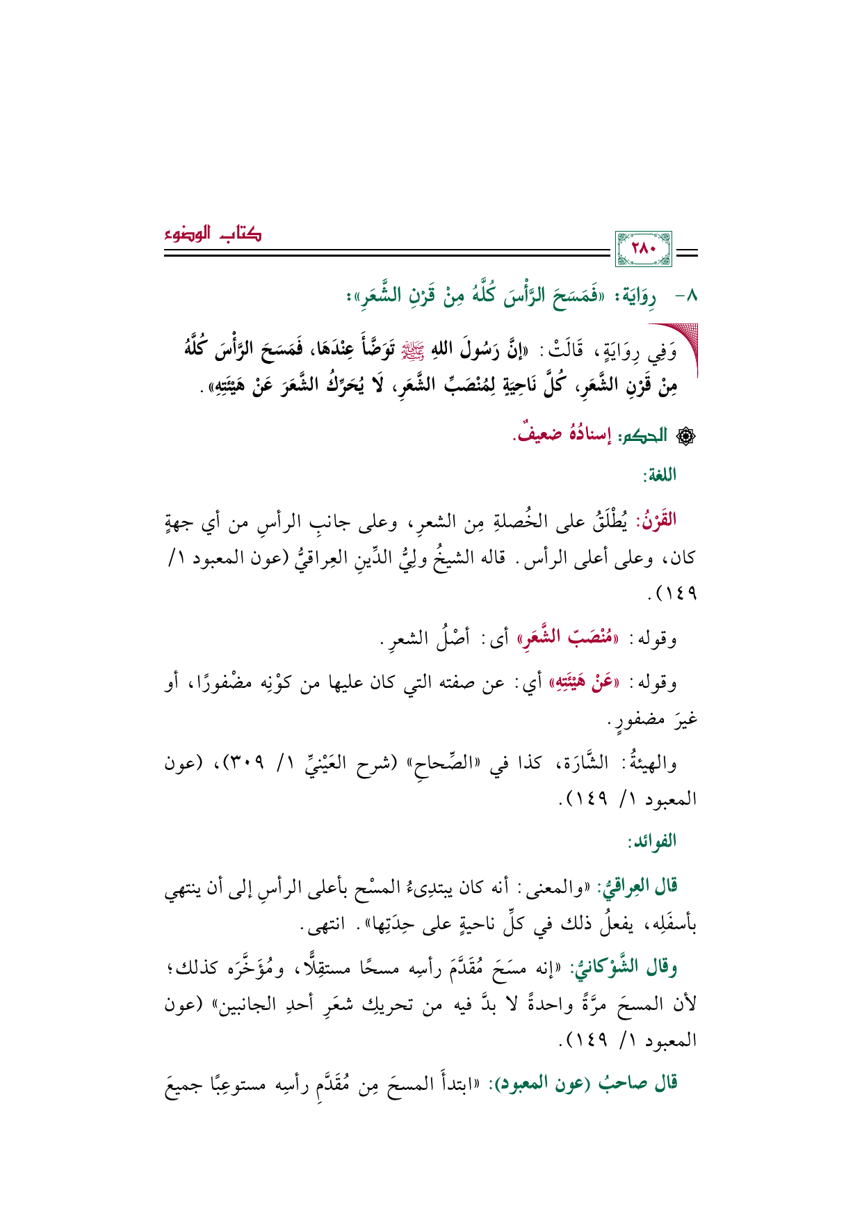 وقال الشَّوْكانيُّ: "إنه مسَحَ مُقَدَّمَ رأسِه مسحًا مستقِلًّا، ومُؤَخَّرَه كذلك؛ لأن المسحَ مرَّةً واحدةً لا بدَّ فيه من تحريكِ شعَرِ أحدِ الجانبين" (عون المعبود ١/ ١٤٩).